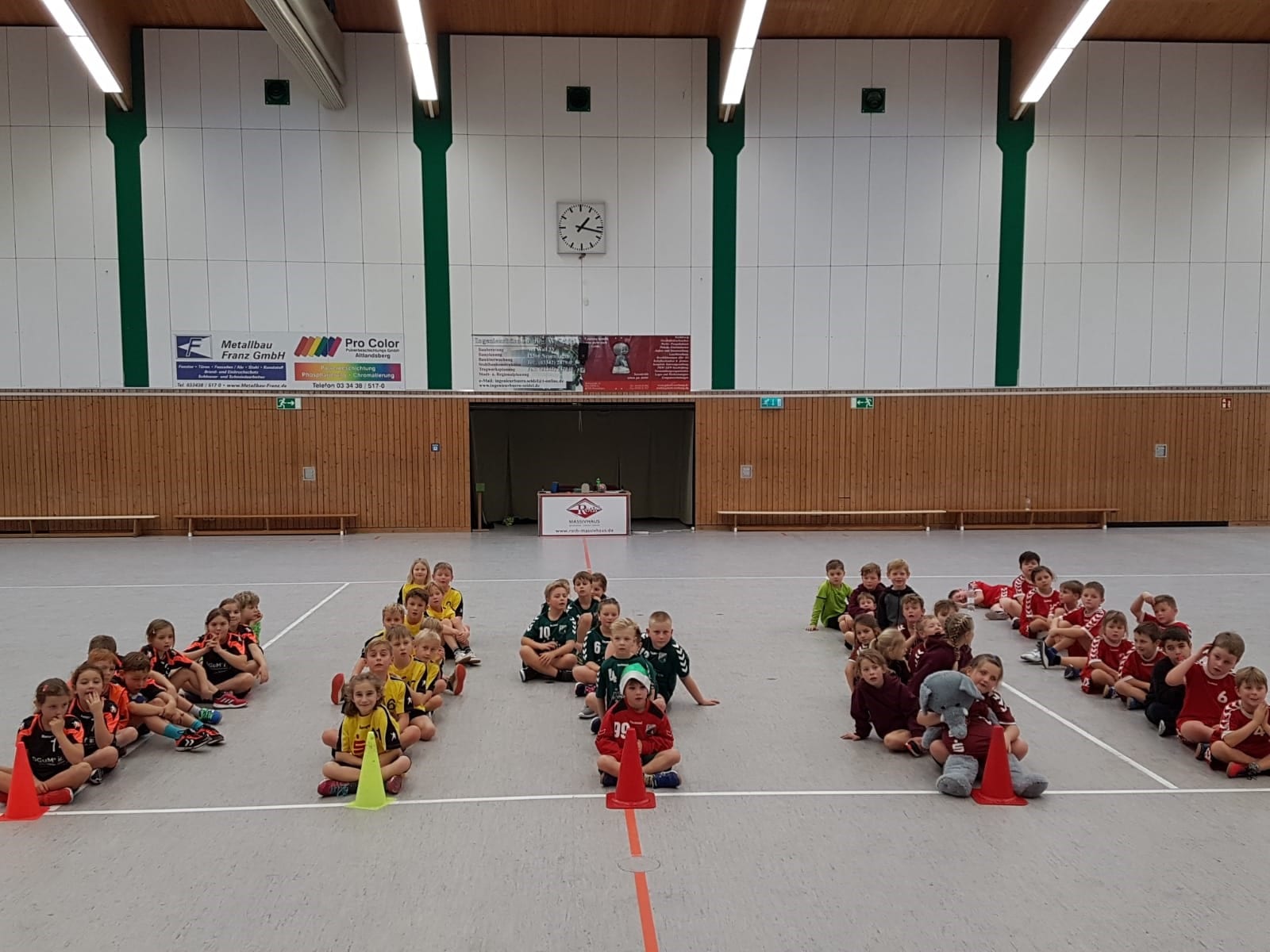 Nach einem gemeinsamen Aufwärmprogramm konnte der Spielbetrieb pünktlich um 10 Uhr beginnen. Und was die Zuschauer auf den sehr gut gefüllten Rängen in den 12-minütigen Spielen zu sehen bekamen, konnte sich in der Tat sehen lassen. Es gab reichlich Tore hüben wie drüben, knappe und umkämpfte Spiele sowie die ein oder andere technische Finesse. Das Niveau aller Mannschaften war durchaus bemerkenswert, auch wenn nicht immer alles gelang. Aber verglichen mit früheren Turnieren waren alle Teams, was die Elemente Passen, Fangen und Torwurf anging, auf einem sehr guten Weg. Auch die Torhüterleistungen waren überragend. Vor allem aber kam der Spaß am Spiel bei allen Mannschaften nicht zu kurz. Denn im Gegensatz zu unseren Erfahrungen aus der E-Jugend waren alle Trainer bemüht, möglichst allen Spielern genügend Einsatzzeiten zu gewähren. Und so sah man am Ende bei der Vergabe der Medaillen nur glückliche Kindergesichter.