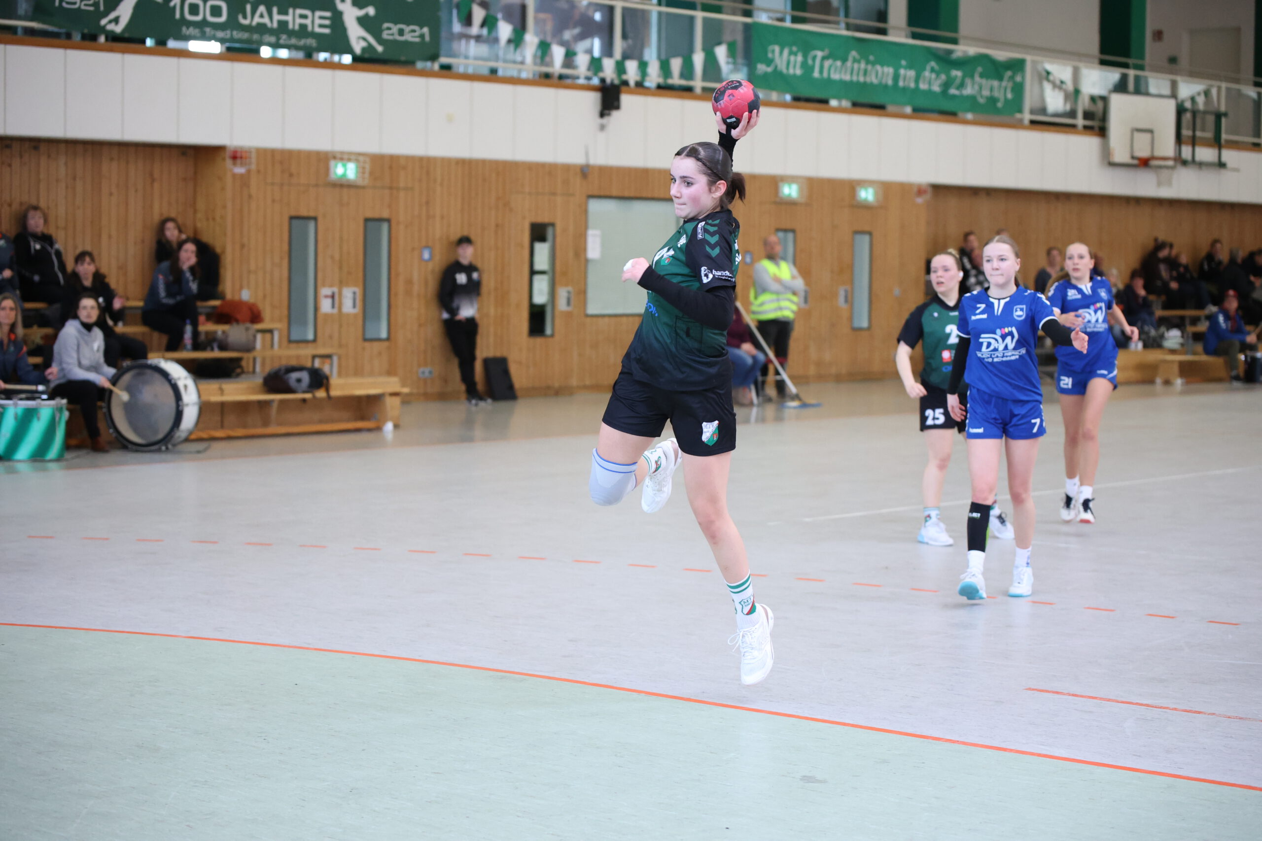 Es ging von Anfang an hoch her, die mitgereisten Fans machten ordentlich Stimmung. Unsere Mädels stimmten sich mit einem neuen Schlachtruf auf das Spiel ein, und so konnte Sarah uns bereits nach der 2. Minute mit 2 Toren in die Führung bringen. Die Wusterwitzer konnten in der 7. Minute ausgleichen, und nun folgte ein Schlagabtausch. Machten wir ein Tor, zog Wusterwitz nach. Die Mädels standen gut in der Abwehr, und auch Emely zeigte gute Aktionen im Tor. Wusterwitz hatte es schwer immer wieder durchzukommen. Im Angriff waren unsere Mädels schnell und überzeugten durch gute Spielzüge. Trotz allem kam es auch immer wieder mal durch ungenaue Pässe zum Ballverlust sodass Wusterwitz wieder kontern konnte. In der 18. Minute gelang jedoch durch Jule ein Torvorsprung von 10:8. Und dieser wurde nun durch weitere Tore von Annalena, Sarah, Romy auf 15:8 ausgebaut. In die Halbzeit ging es mit einem Vorsprung von 18:10. Alle hofften das unsere Mädels nach der Halbzeit genauso weitermachen, und den Sieg sicher nach Hause holen.