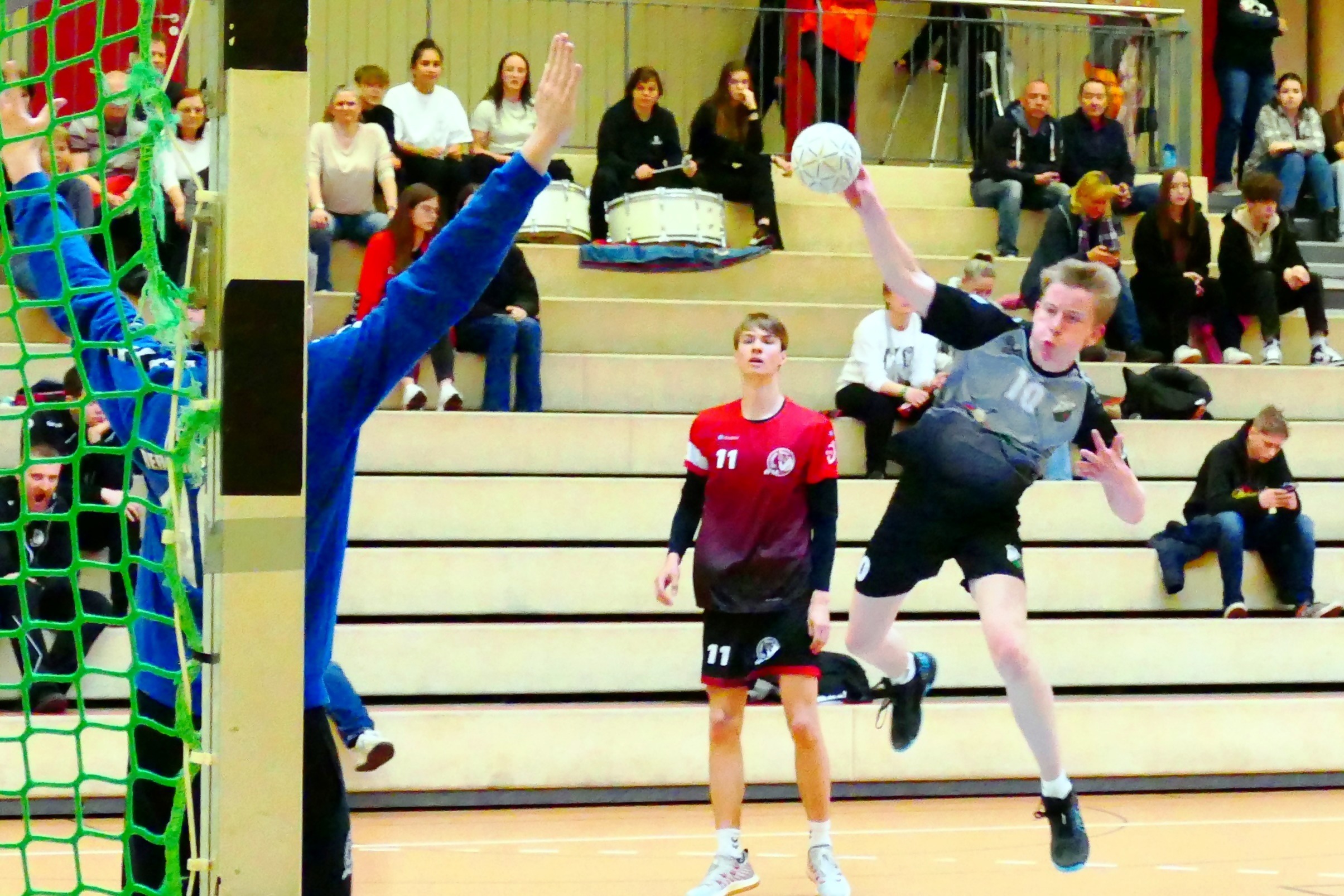 Nach insgesamt 35 Toren ging es mit einer knappen Heim-Führung von 18:17 in die Kabinen – und anschließend munter weiter im Ping-Pong-Takt. Die ausgeglichene Partie bot eine solide Abwehr und viele sehenswerte Spielzüge auf beiden Seiten. Aus dem Rückraum gelang Bernau zwar der größere Erfolg. Doch den besseren Torhüter hatte Altlandsberg: Ben bot 60 Minuten lang eine starke Leistung und konnte einige 100%-Chancen des Gegners scheinbar mühelos abwehren. Bei zwei 7-Metern musste er sich zwar geschlagen geben, aber dafür donnerte Yannick auf der anderen Seite sechs von sechs Strafwürfen ins Netz. Ansonsten kam er weniger zum Zuge, was an der guten 1:1-Deckung des Gegners lag. Und der ging nicht mit Samthandschuhen vor in einem Spiel mit insgesamt 12 Zwei-Minuten-Strafen, sechs gelben Karten und einer Disqualifikation.