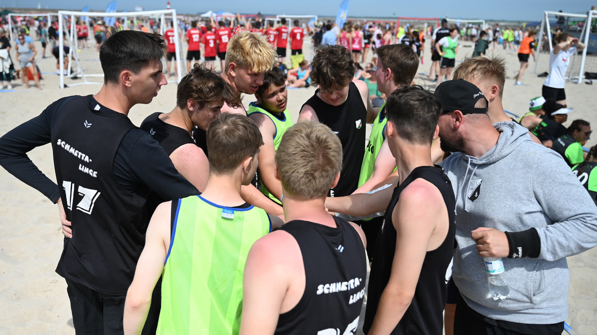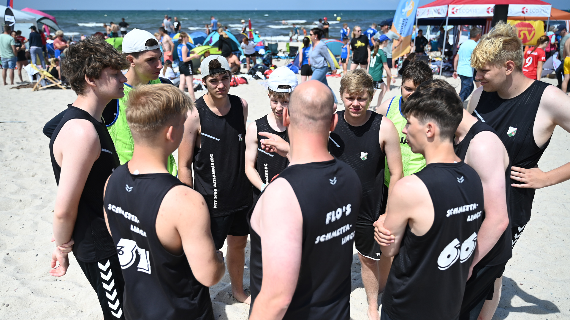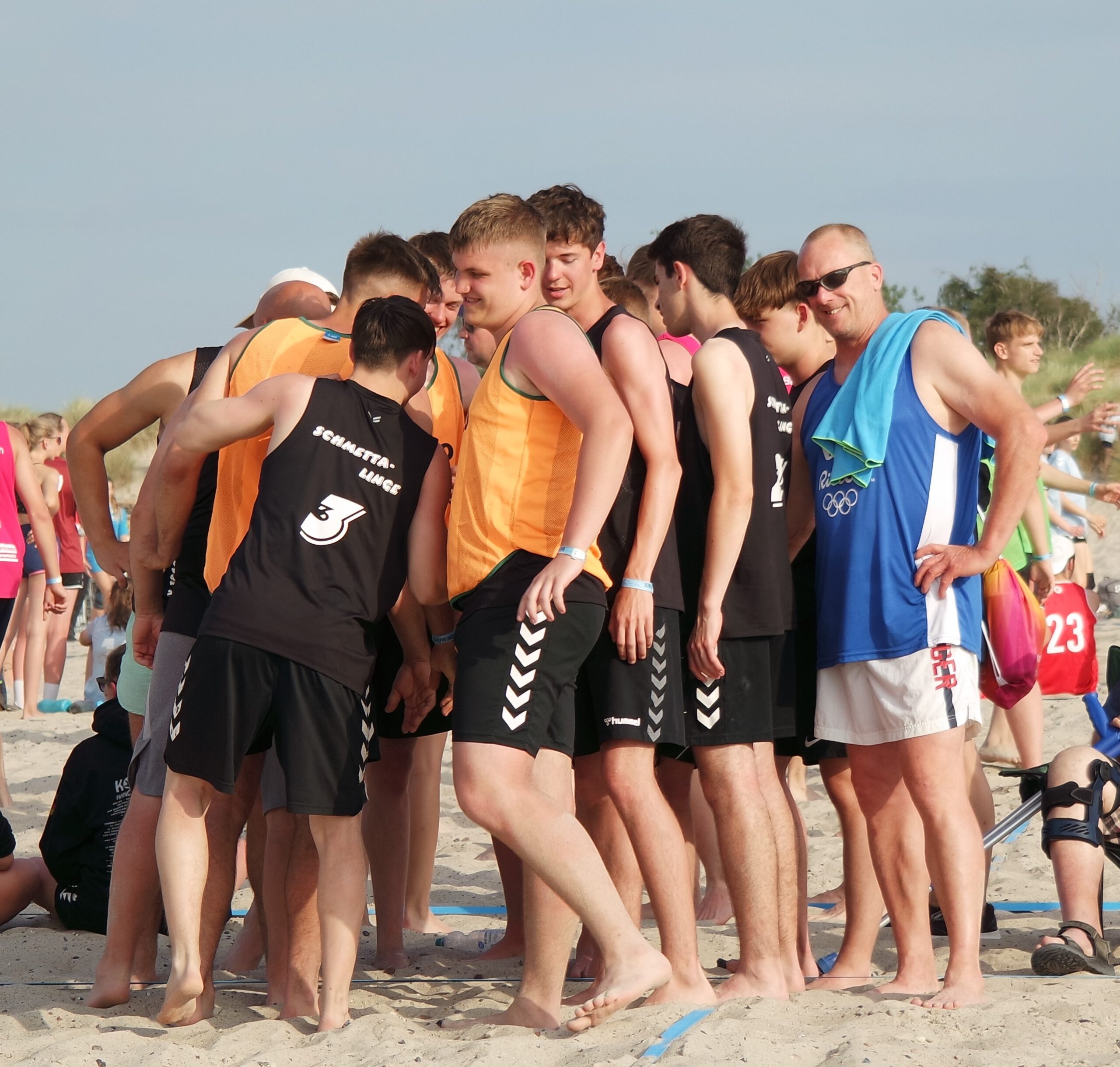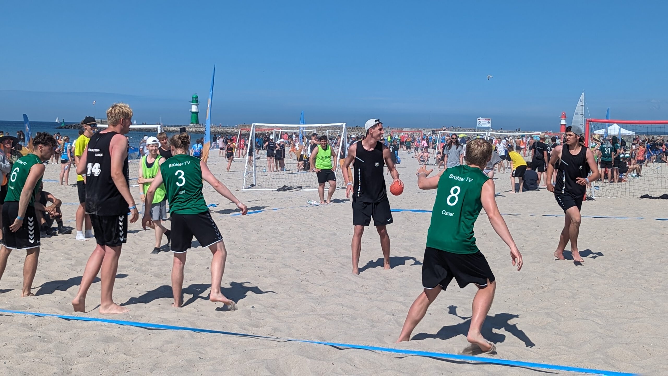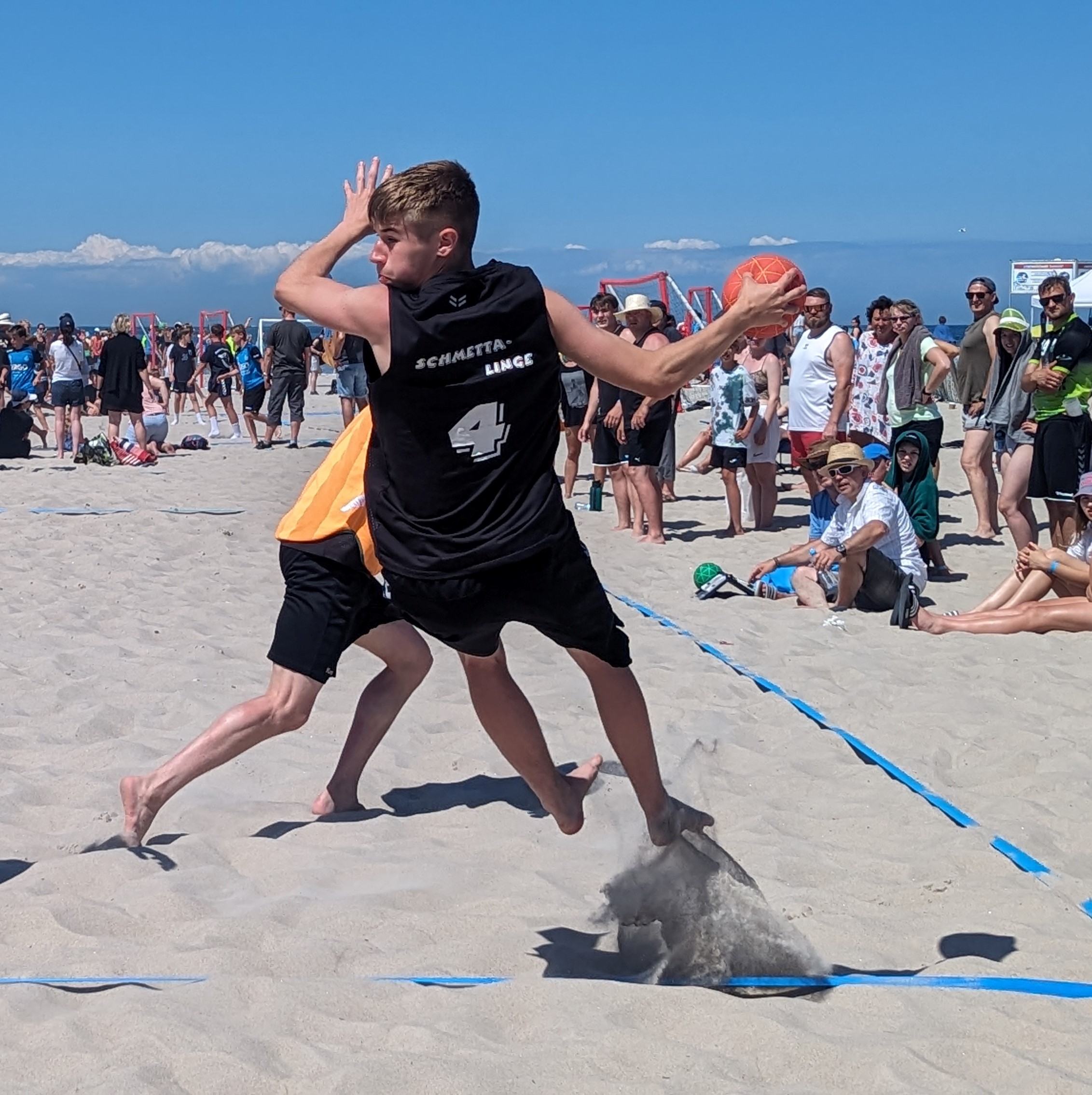 Nach der ersten kurzen Nacht in der Warnemünder Jugendherberge setzte die B-Mannschaft am Samstag um 12:40 Uhr das erste Spiel leider buchstäblich in den Sand. Trainer Flo hatte neben Torhüter Christoph mit Chrissi, Jack, Linus, Luca, Nils Z. und Noah gleich sechs Kreisläufer zu bieten und komplettierte mit drei Linkshändern (Doni, Nils F. und Willem) seine bunt zusammengewürfelte Truppe. Doch auch wenn die Siegchancen so klein wie ein Sandkorn am Ostseestrand waren, kämpften die MTVler heldenhaft gegen den HSV Oberhavel. Am Ende wurden beide Halbzeiten verloren und spornten die A-Mannschaft mit Trainer Kochi an, um 13:20 Uhr gegen Spandau besser ins Turnier zu starten. In der ersten Halbzeit gelang das auch Ben und seinen Vorderleuten Niklas, Yannick, Leon, Lion, Arne, Nick, Peter und Scott. Punkt Nummer 1 stand und sorgte für Auftrieb unter den Flügeln der SCHMETTA-linge. Doch die zweite Halbzeit und das anschließende Shoot-Out gingen auf das Konto der Berliner.