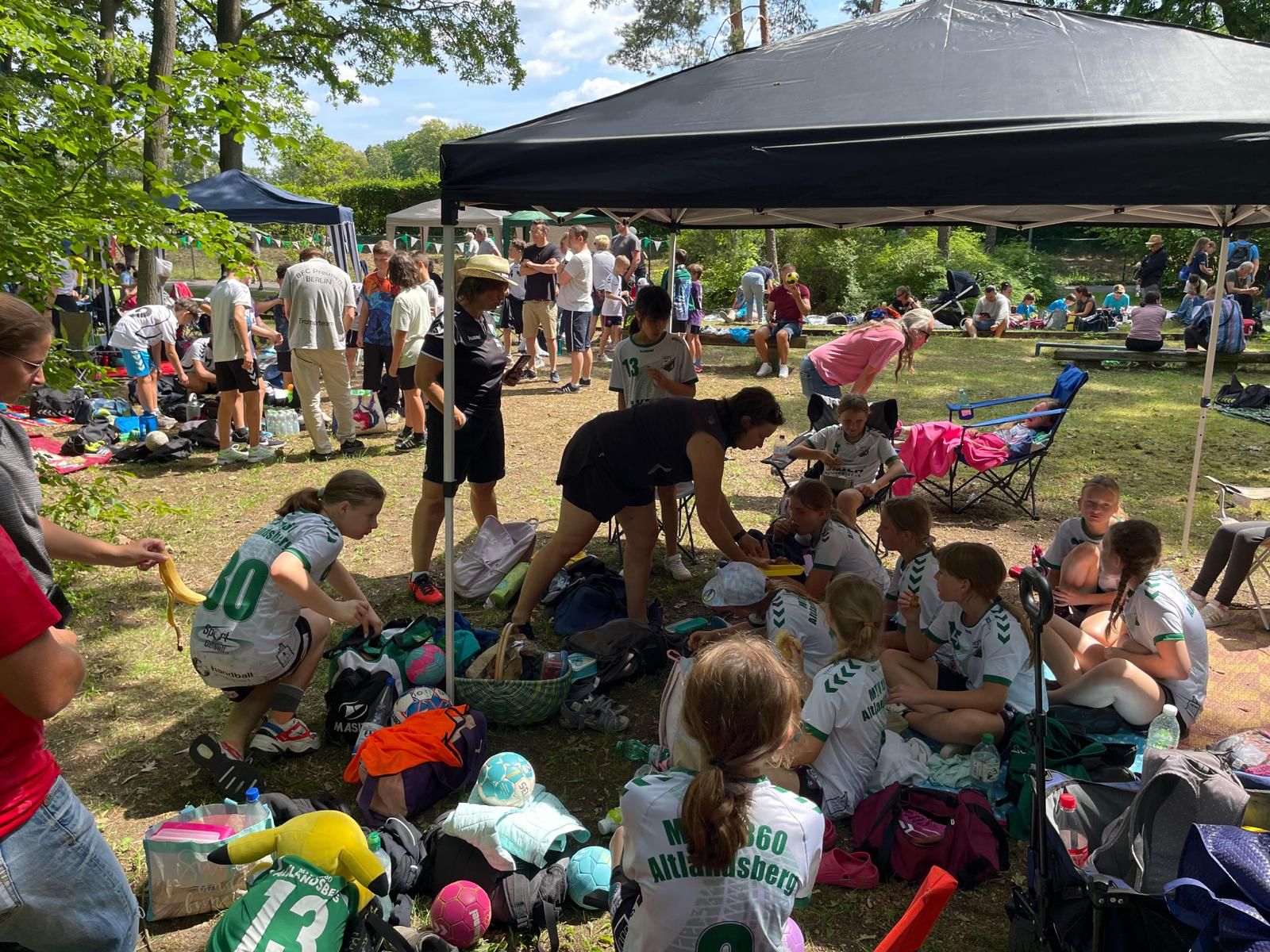 und die E/Dw des MTV 1860 Altlandsberg hatte Riesenspaß beim traditionellen Rasenturnier in Berlin Spandau. Das Wetter war perfekt, nicht zu heiß, ein Windchen und ein paar Wolken, so starteten unsere 12 Spielerinnen kurz nach 10.00 Uhr auf den Spandauer Handballfeldern ins Turnier.