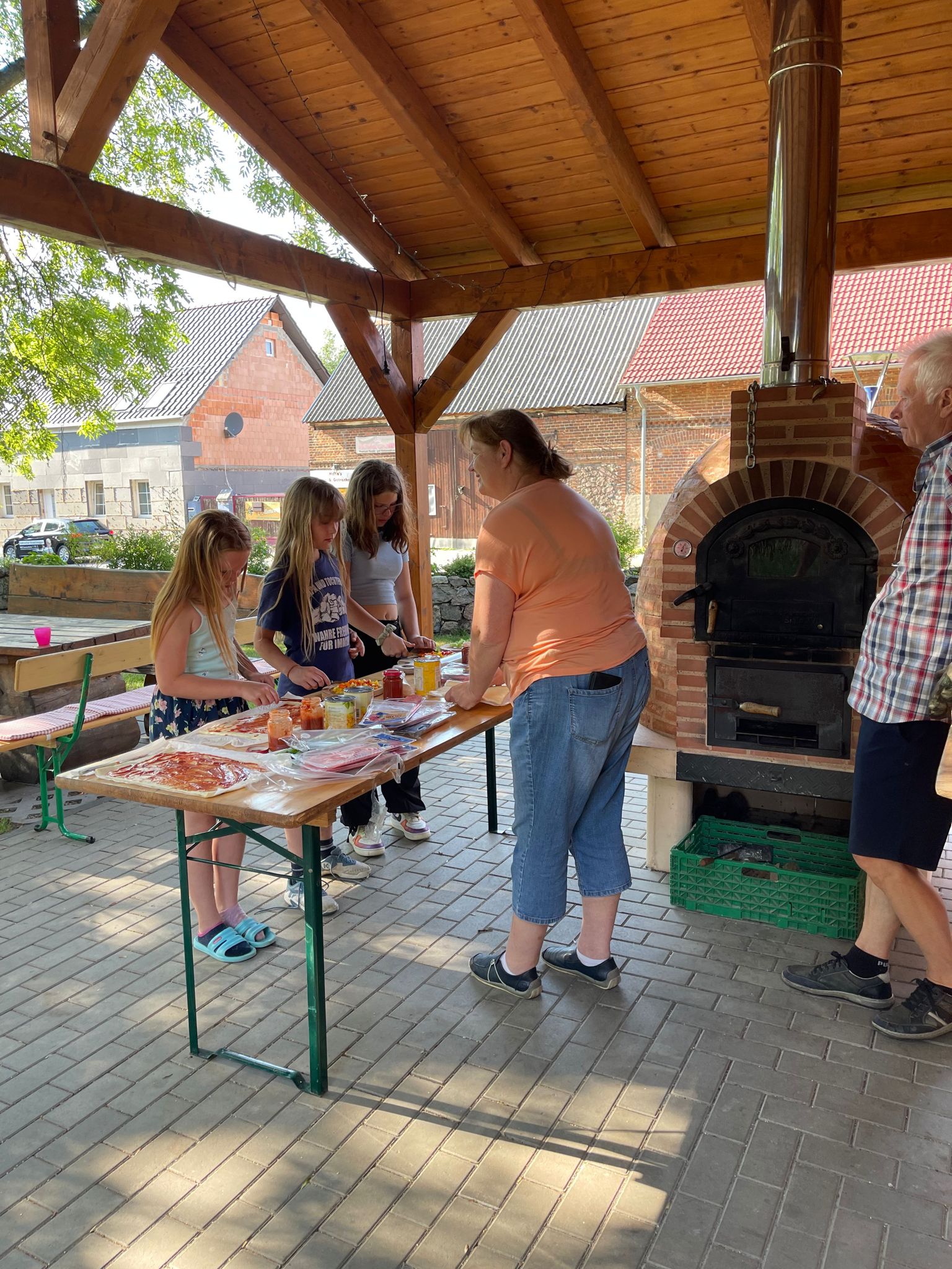 Abends wurde der Holzbackofen der Gemeinde Wegendorf gut angeheizt und die eigene Pizza kreativ belegt und gebacken.