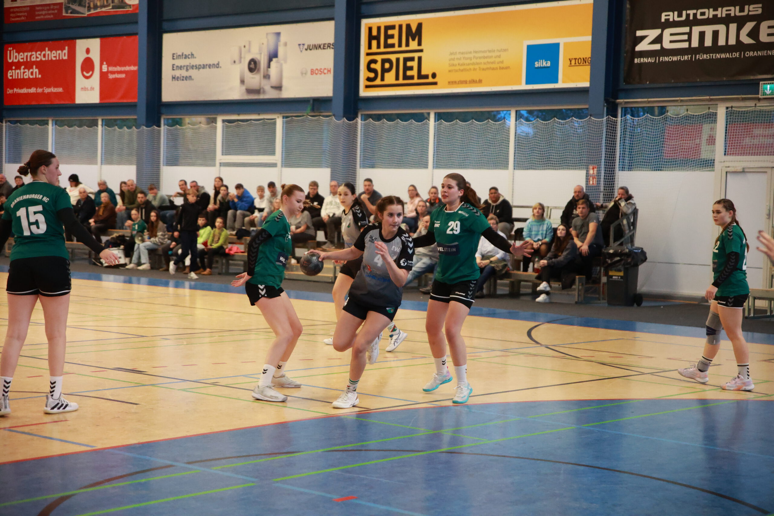 Vergangenen Sonntag waren wir beim Oranienburger HC zu Gast. Um 16 Uhr starteten wir gegen unseren bisher unbekannten Gegner. Zunächst brachte sich Oranienburg in Führung, aber unsere Mädels zogen nach. Es wurde ein Austausch der Tore. Immer wieder gelang uns und auch den Gegnern der Ausgleich. Keiner schaffte es in der ersten Halbzeit einen Vorsprung zu bekommen. So stand es zur Halbzeit 8:8. Die zweite Halbzeit startete so, wie die Erste aufgehört hat. Tor für Tor auf beiden Seiten, ohne das sich jemand absetzen konnte. Zur 42. Minute stand es 14:14. Eine 2-Minuten-Strafe auf unserer Seite nutzen die Oranienburger sofort und effektiv aus. Hierdurch liess sich unsere Abwehr irritieren, und technische Fehler waren die Folge. Es gelangen 2 Tore infolge, und brachte somit Oranienburg die Führung. Diana konnte zwar in der 44. Minute zum 16:15 verkürzen, aber Oranienburg blieb dran. Unsere Abwehr stand nicht mehr richtig, und machte es leider den Oranienburger ziemlich leicht, das Spiel für sich zu entscheiden. In der 46. Minute nahm unser Trainer nochmal eine Auszeit, es stand nun 17:15. Leider brachte diese aber nicht viel, denn Oranienburg legte noch ein Tor oben drauf. Kaja konnte in der 49. Minute noch einen 7m verwandeln, und sorgte so für einen Endstand von 18:16.