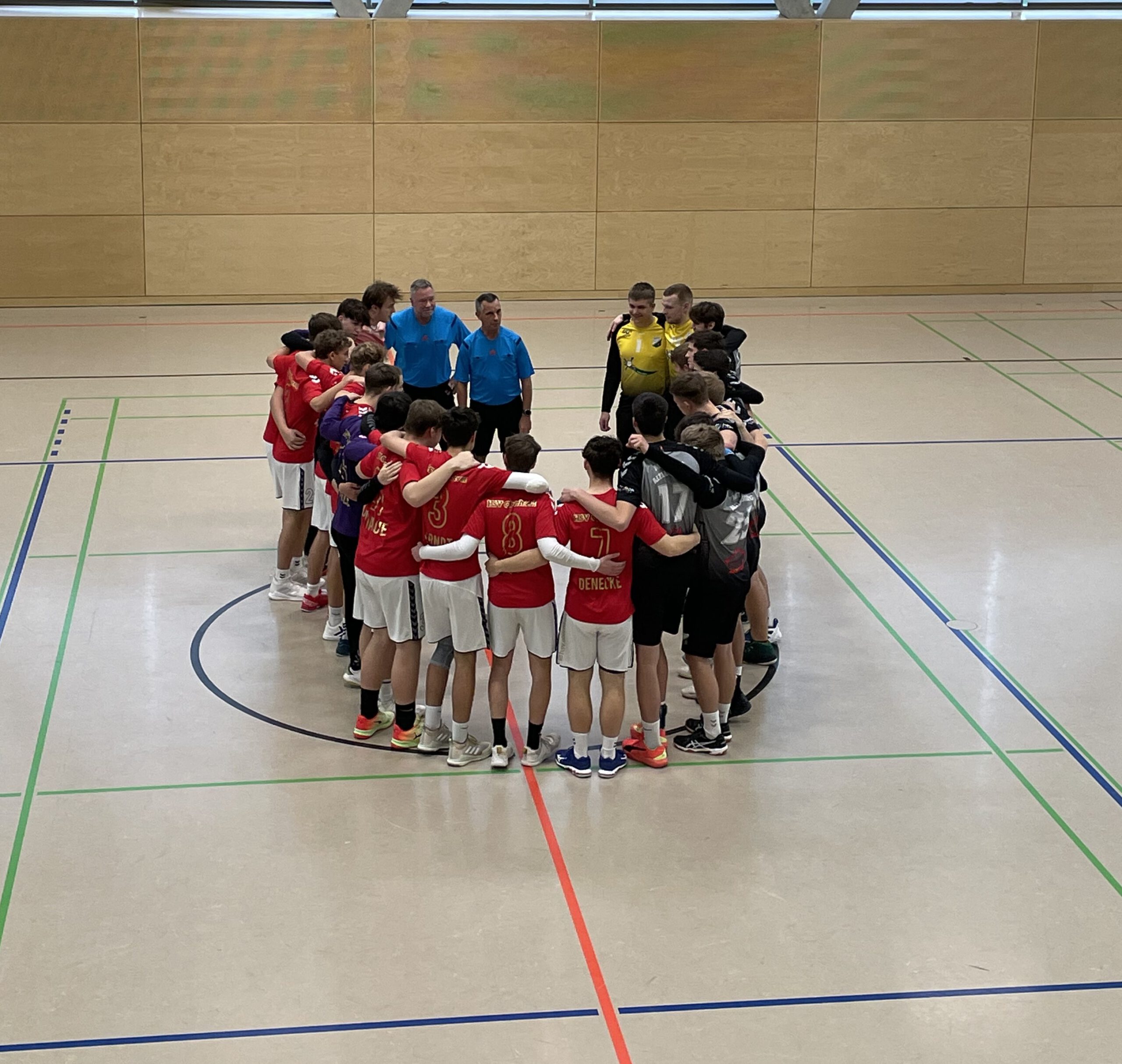 Von jetzt an ging es hin und her. Traf der HSV, legte der MTV nach und hielt seinen Abstand. Das ging ganze 15 Minuten so, bis die Heimmannschaft ihr Timeout nahm. Hier konnten die Spieler nochmal eine Minute Pause machen, Luft schnappen und einen Schluck trinken, um dann die letzten sieben Spielminuten zu bestreiten. Der MTV nahm nochmal seine letzte Kraft zusammen und erwischte die Gastgeber auf dem falschen Fuß. Einläufer von Linus und Dominik schafften viel Platz für die Rückraumspieler Leon und Nick, welche mit einem schnellen Doppelschlag die 4-Tore-Führung wiederherstellten und wenige Minuten später besiegelte Nils Z. den Endstand von 23:27 und somit die nächsten 2 Punkte auf dem Konto unserer A-Jugend.