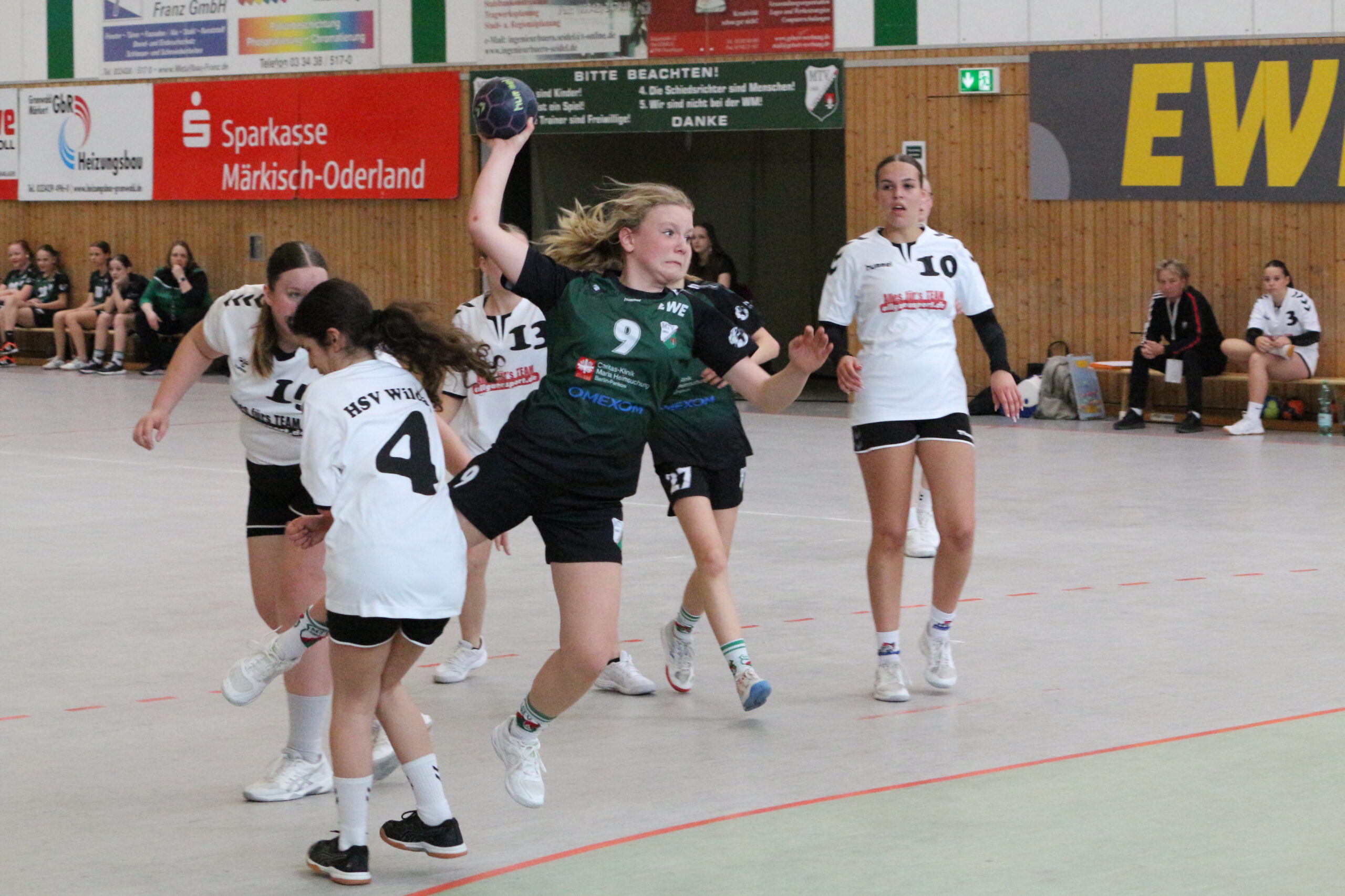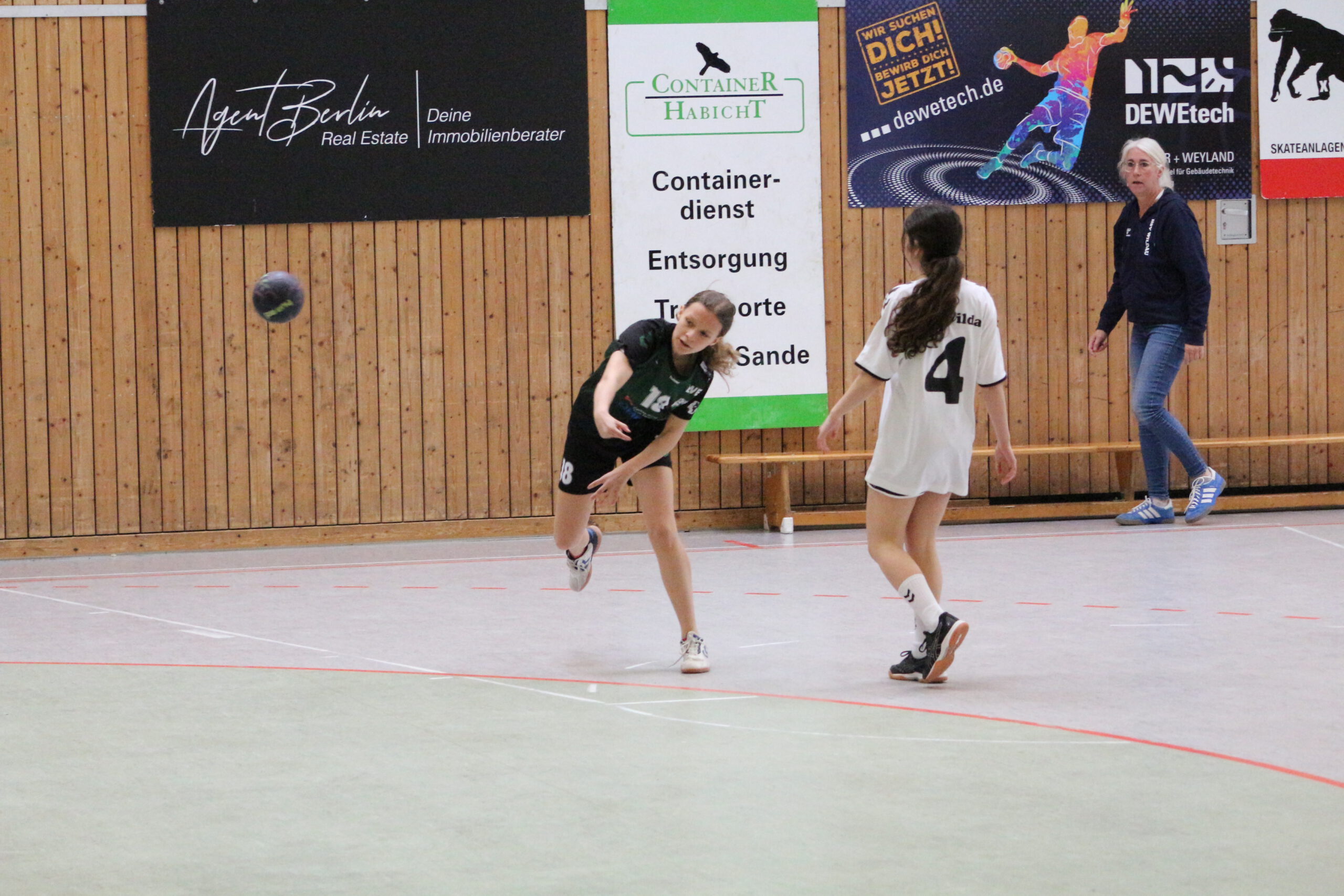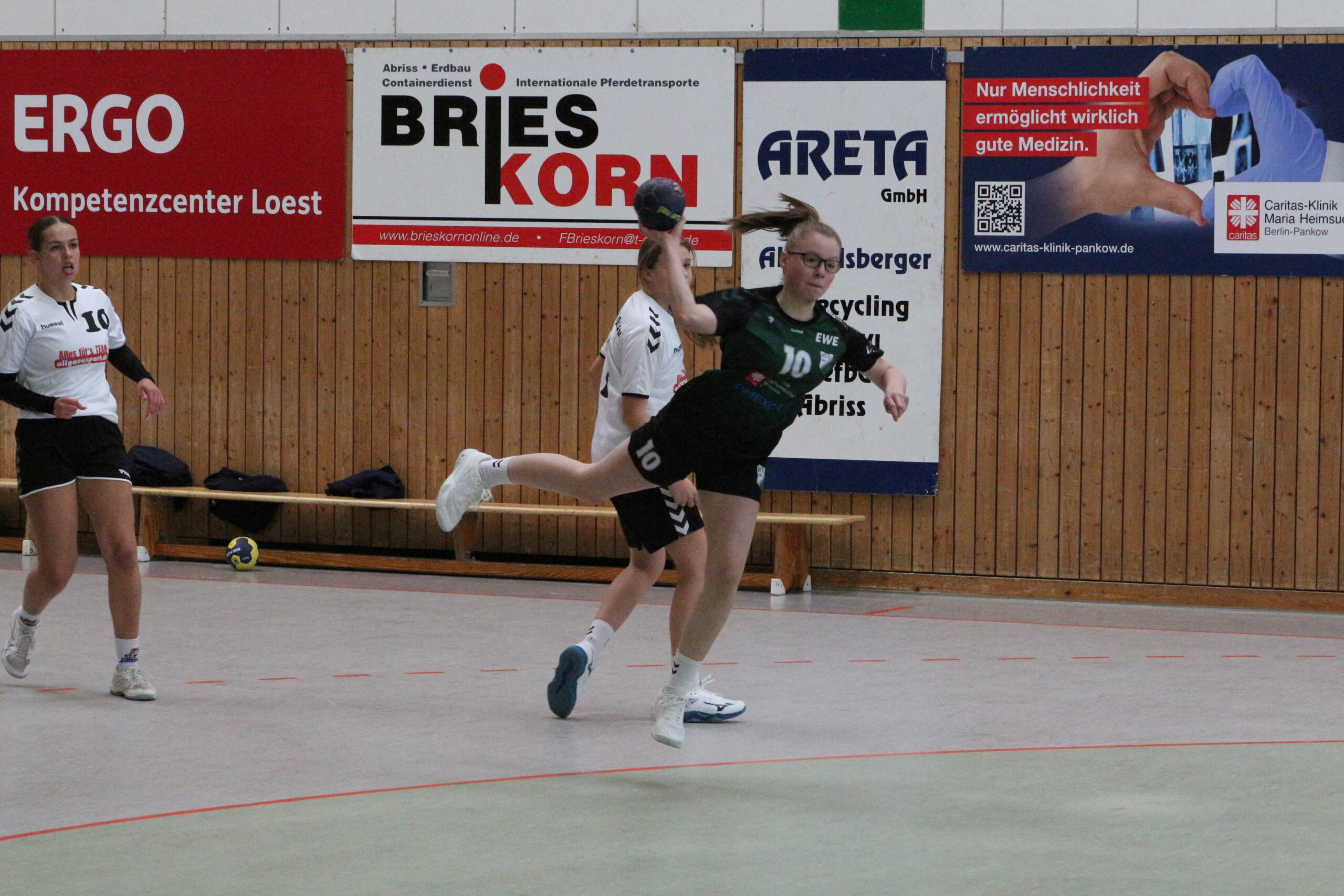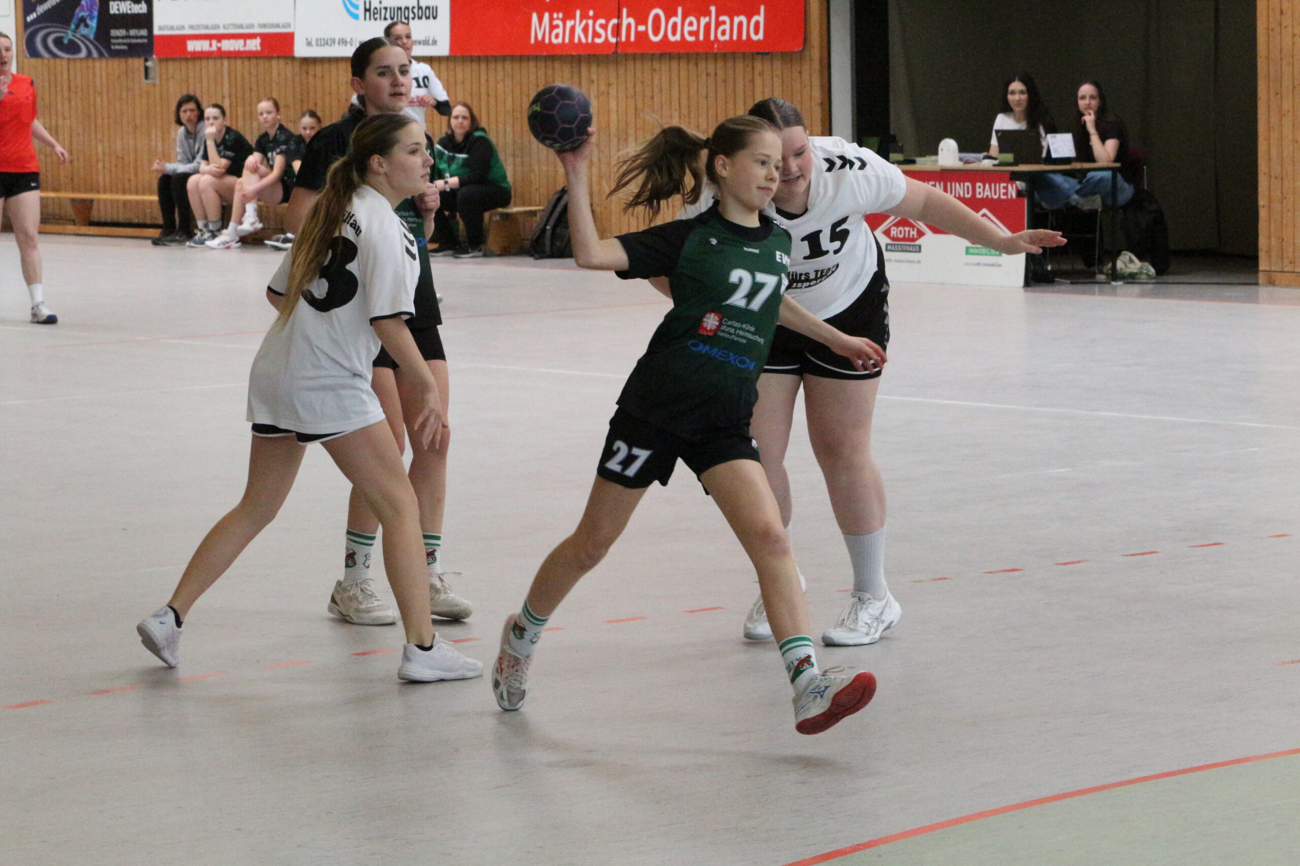 Am Samstag dem 20.04.2024 um 12 Uhr erwarteten wir die Mädels vom HSV Wildau. Gleich mit Spielbeginn dominierten wir mit 6:2 durch Tore von Helene, Kaja und Lea. Die Abwehr stand sicher und Wildau verlor viele Bälle, welche wir leicht für Gegenstürme umsetzten und nutzten. Nach 15 Minuten gingen wir nach Toren von Anna-Lena und Sarah auf einen Vorsprung von 8 Toren. Die Gegnerinnen ließen nicht nach und erkämpften sich einige Bälle, doch Emely hielt diese wunderbar. Nach 25 Minuten war die erste Halbzeit vorbei und wir führten 19:10 gegen den HSV Wildau.