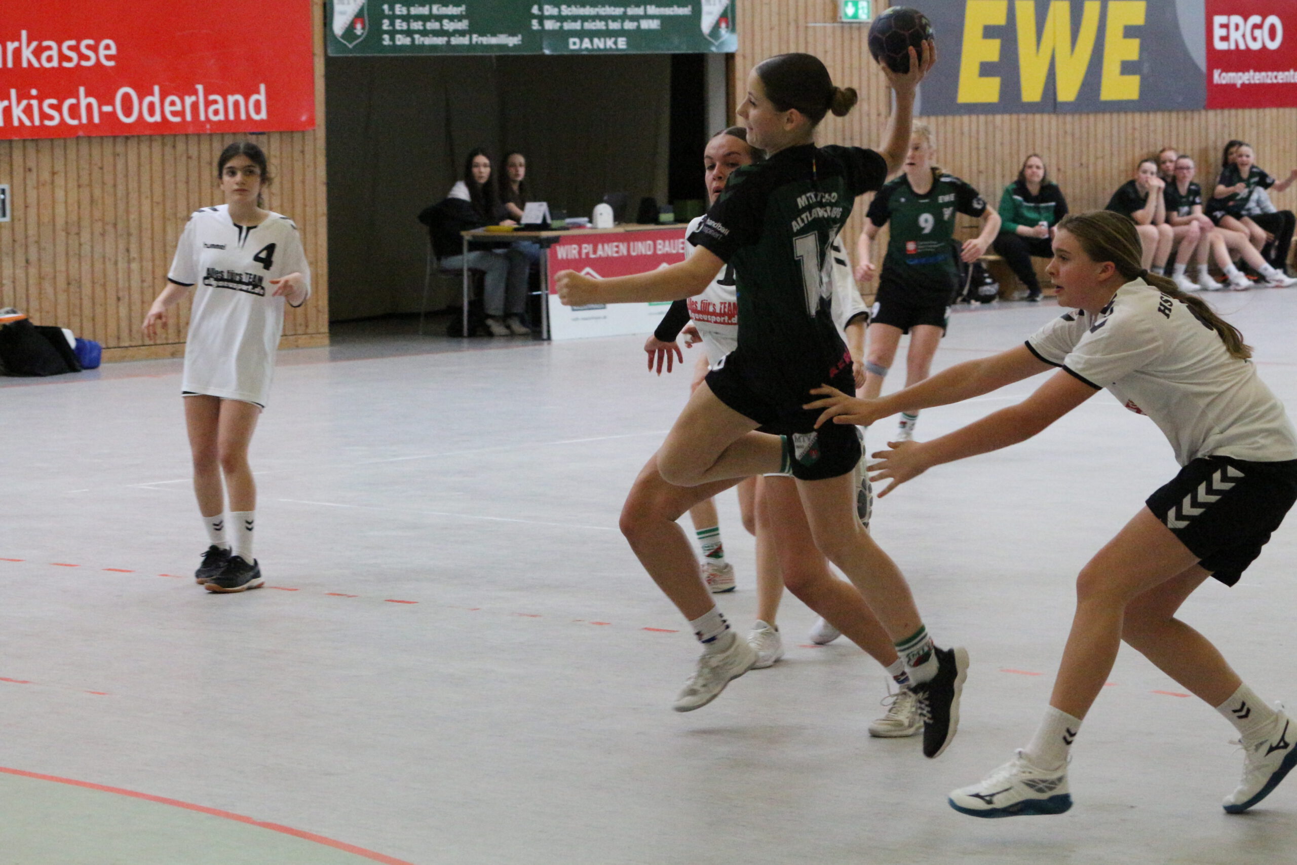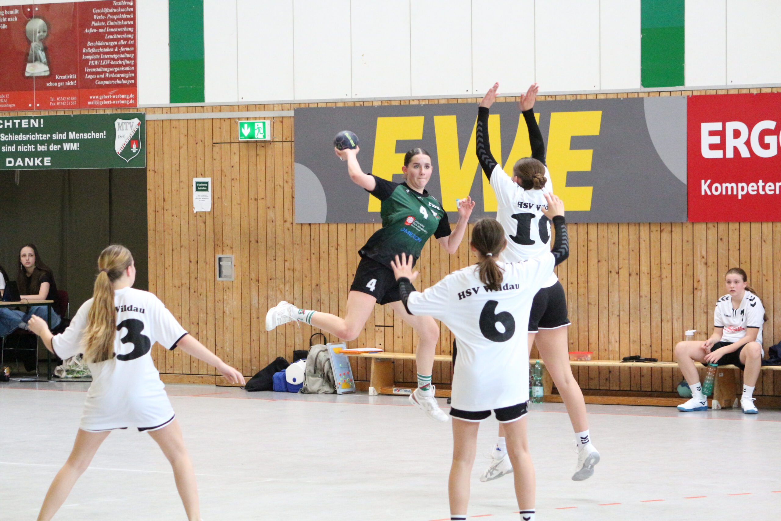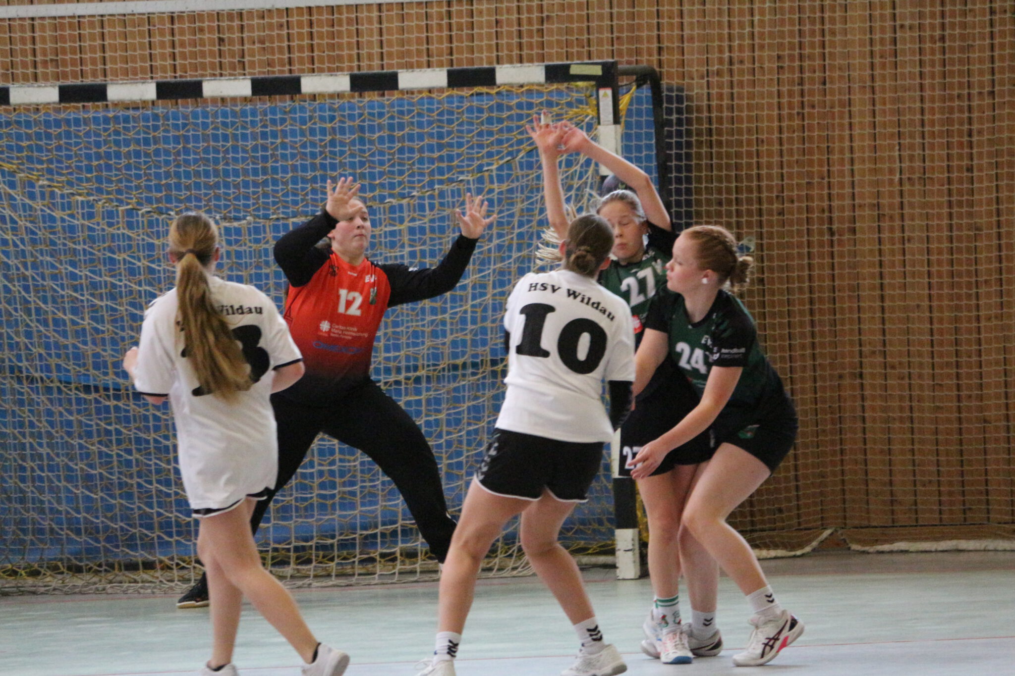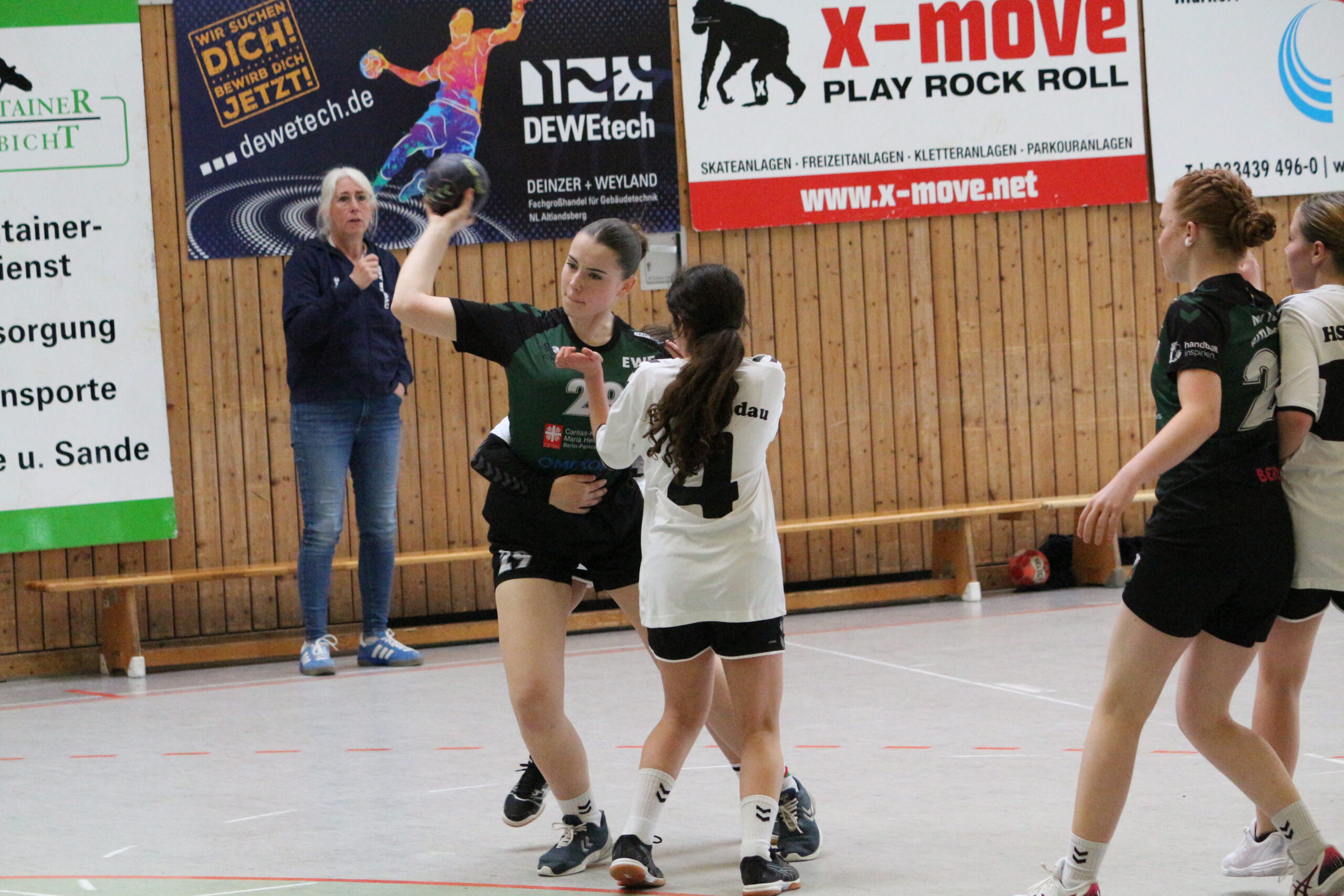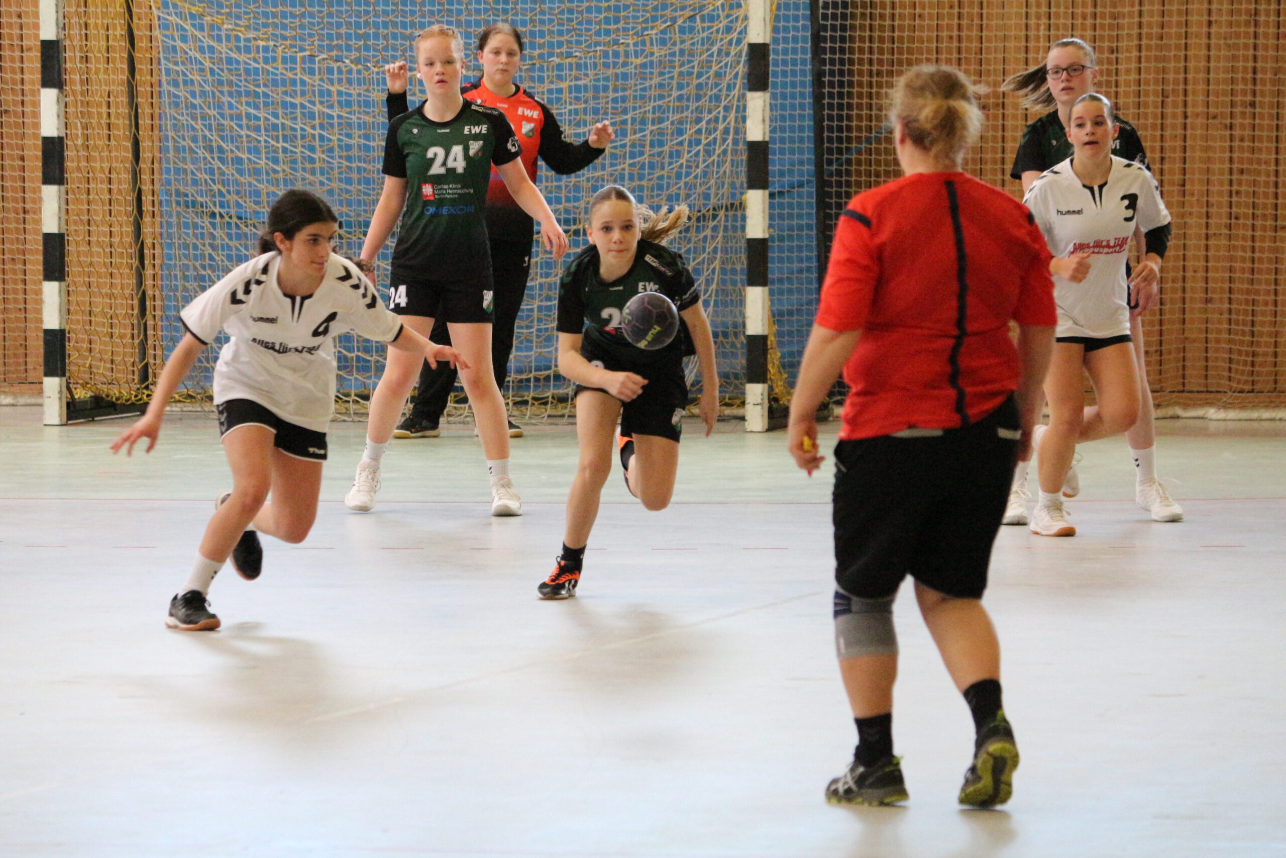 Am Samstag dem 20.04.2024 um 12 Uhr erwarteten wir die Mädels vom HSV Wildau. Gleich mit Spielbeginn dominierten wir mit 6:2 durch Tore von Helene, Kaja und Lea. Die Abwehr stand sicher und Wildau verlor viele Bälle, welche wir leicht für Gegenstürme umsetzten und nutzten. Nach 15 Minuten gingen wir nach Toren von Anna-Lena und Sarah auf einen Vorsprung von 8 Toren. Die Gegnerinnen ließen nicht nach und erkämpften sich einige Bälle, doch Emely hielt diese wunderbar. Nach 25 Minuten war die erste Halbzeit vorbei und wir führten 19:10 gegen den HSV Wildau.