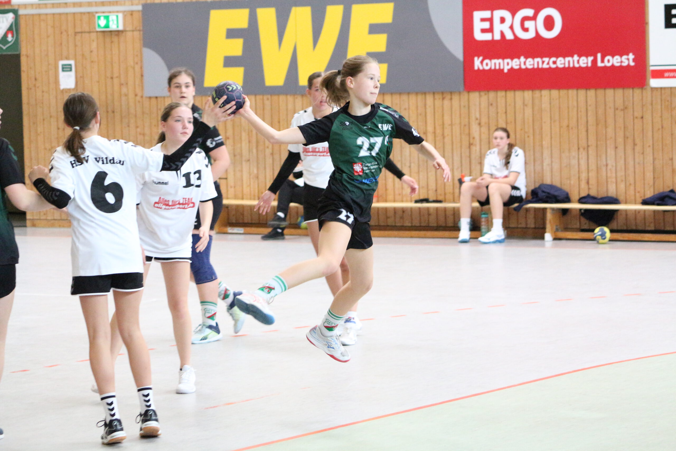 Nach der Pause kamen wir wieder gut ins Spiel und ließen in den ersten 10 Minuten der 2. Halbzeit nur 1 Tor zu. Wir selbst trafen vorne weiterhin und Hannah, Mia und Nele gesellten sich mit in die Torliste ein. In der 40. Minute bekam eine Gegenspielerin rot, was uns noch mehr anspornte und so kamen auch Elenor und Svea zu ihren wohlverdienten Toren. Am Ende gewannen wir das Spiel mit 35:15.
