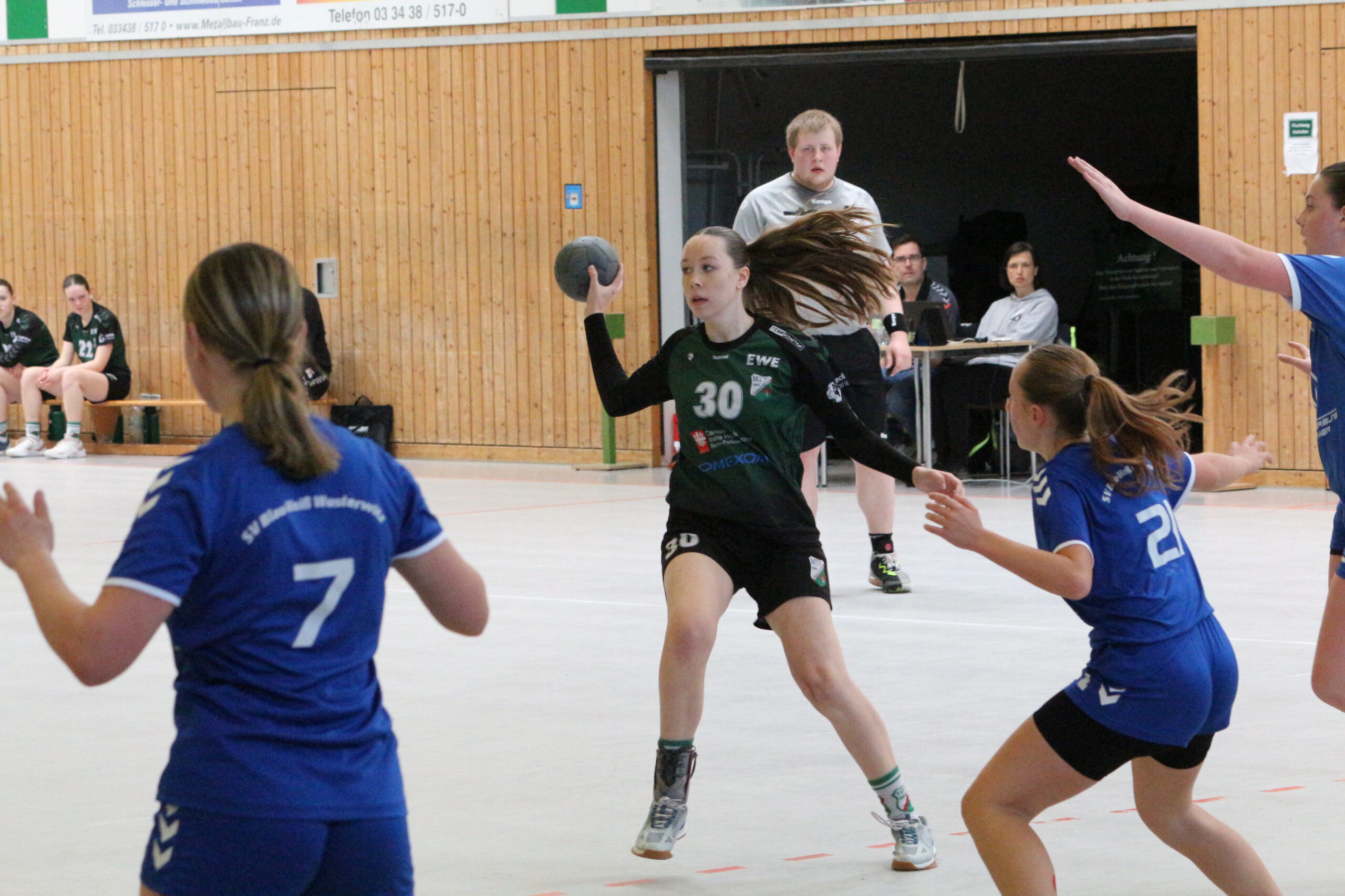 Im letzten Saisonspiel der weiblichen B-Jugend empfingen wir die Mädchen vom SV Blau-Weiß Wusterwitz und mit einem Sieg wollten wir die Saison beenden. Das Hinspiel hatten wir noch klar mit 7:19 gewonnen. Doch so leicht wollten es die Gegnerinnen uns nicht machen. Der Beginn der ersten Halbzeit gestaltete sich zäh. So richtig ins Spiel kamen die Mädchen nicht. Wir gingen zwar in Führung, doch die gegnerischen Mädchen blieben dran, verkürzten und glichen aus. Erst in der 21. Spielminute gelang es uns, uns etwas abzusetzen und eine 2 Tore Führung zu erarbeiten. Ab da lief es besser. Die Mädchen packten in der Abwehr beherzter zu und im Angriff gelang ihnen das Positionsspiel nun besser. Zur Pause ging es mit 11:7 für uns.