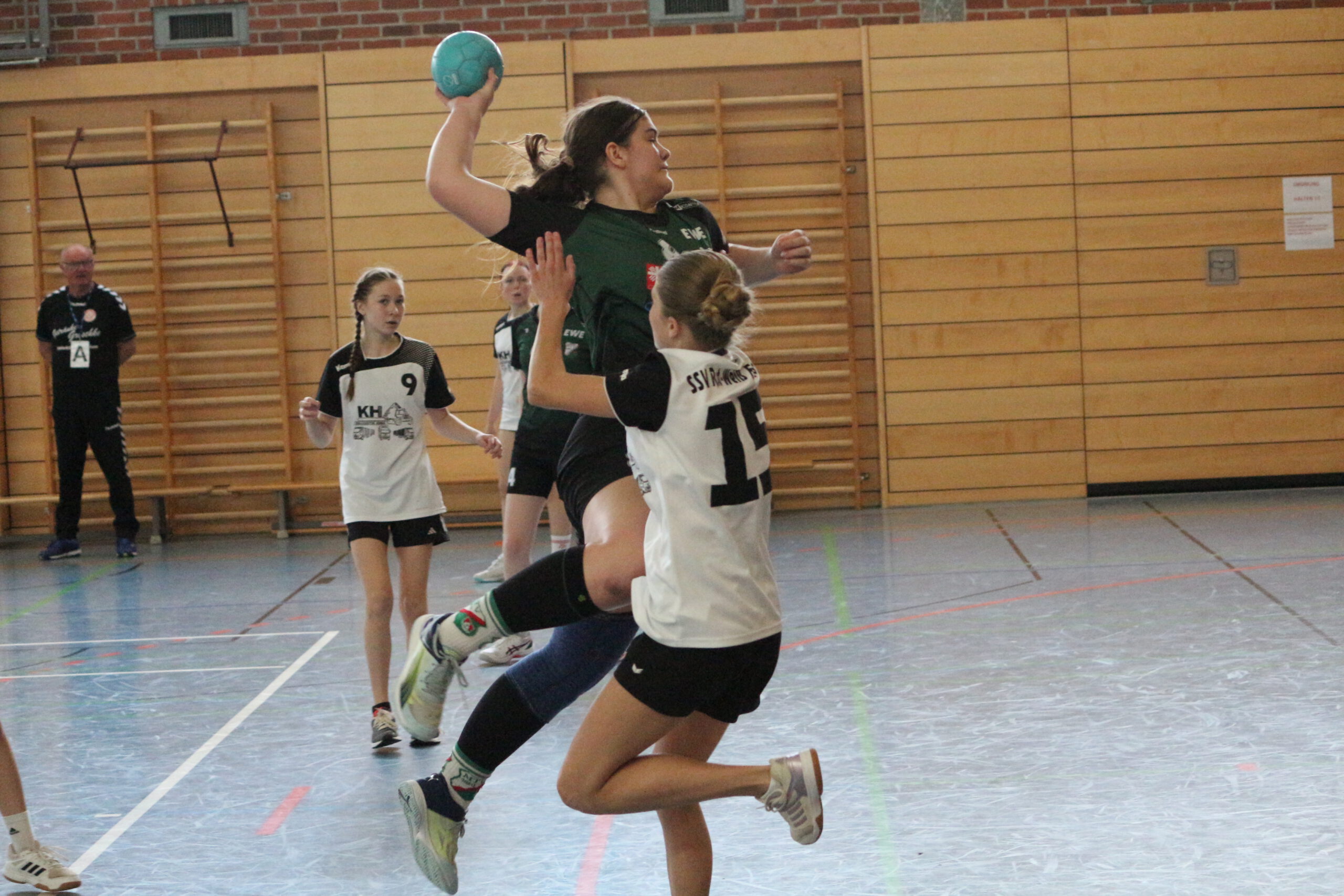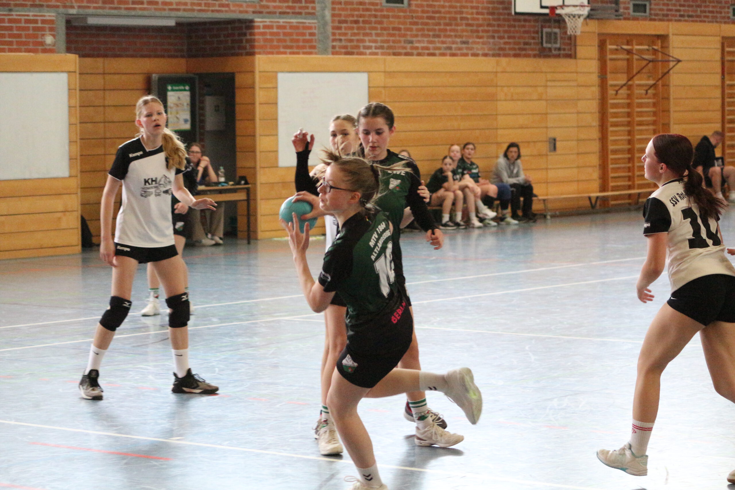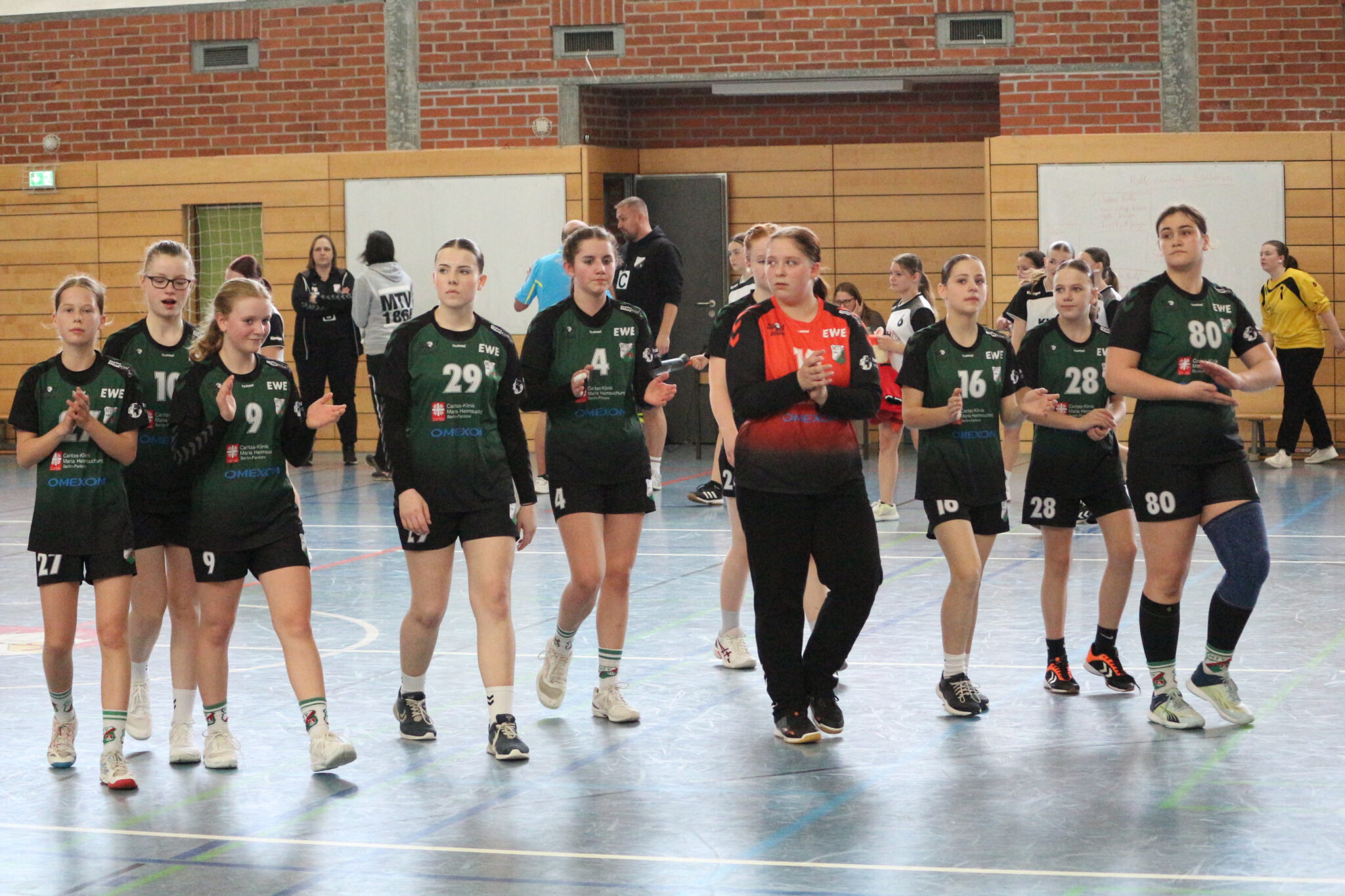 Das Spiel startete gut und alle kamen mindestens einmal zum Torwurf. Die Abwehr ackerte und unterband viele Pässe der Gegnerinnen. Schon nach kurzer Zeit führten wir komfortabel mit 9:2. Doch irgendwie kam dann ein Umbruch und die Stimmung kippte. Im Angriff leisteten sich die Mädchen einige Fehlwürfe und auch das Umstellen im Angriff, unsere Außen sollten nur in den Ecken stehen, ging nicht auf. Der Rückraum arbeitete weiter mit vielen Einzelaktionen, doch ein richtiger Spielfluss wollte sich nicht mehr so recht einstellen. In die Pause gingen die Mädchen gefrustet beim Stand von 13:4 für uns.