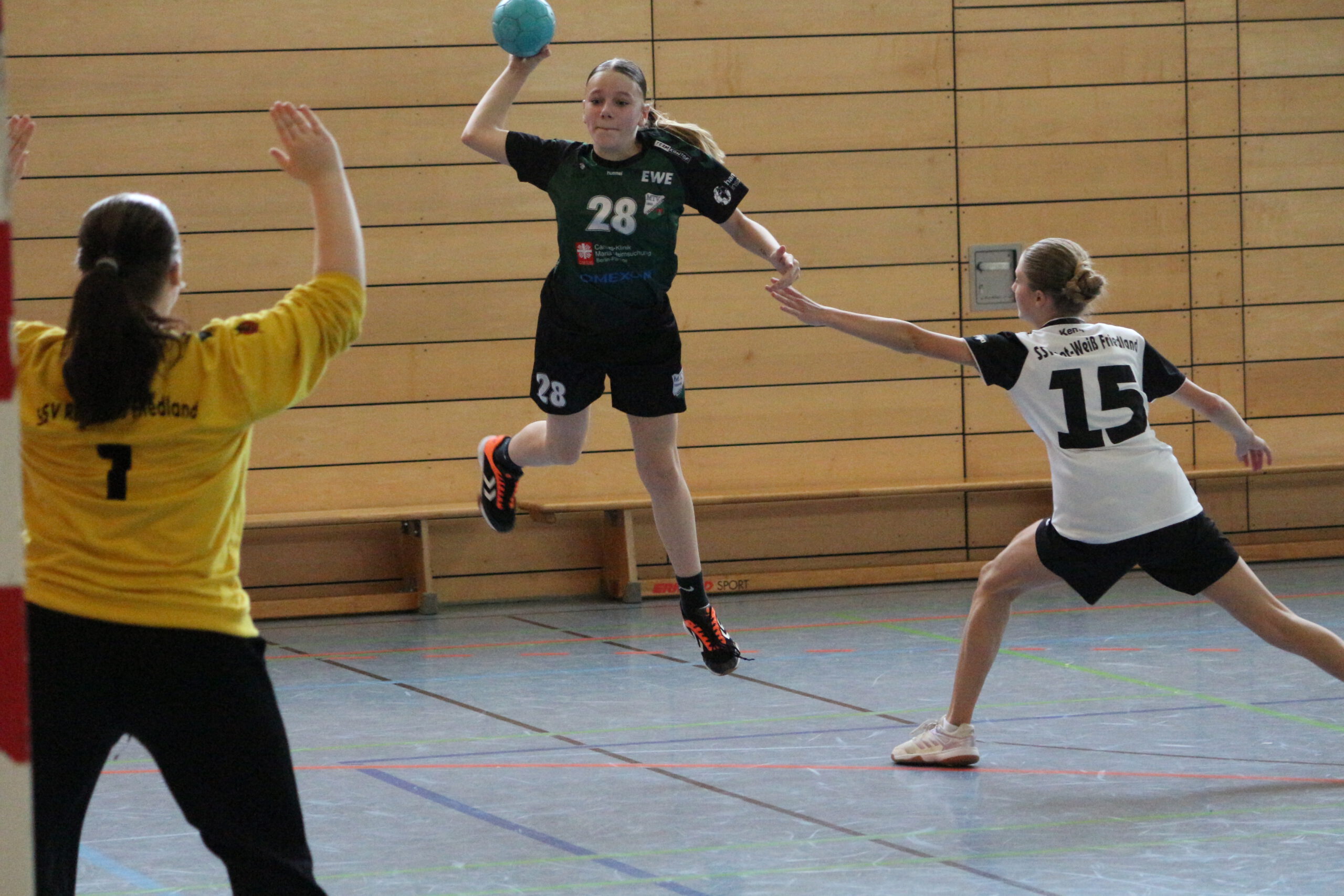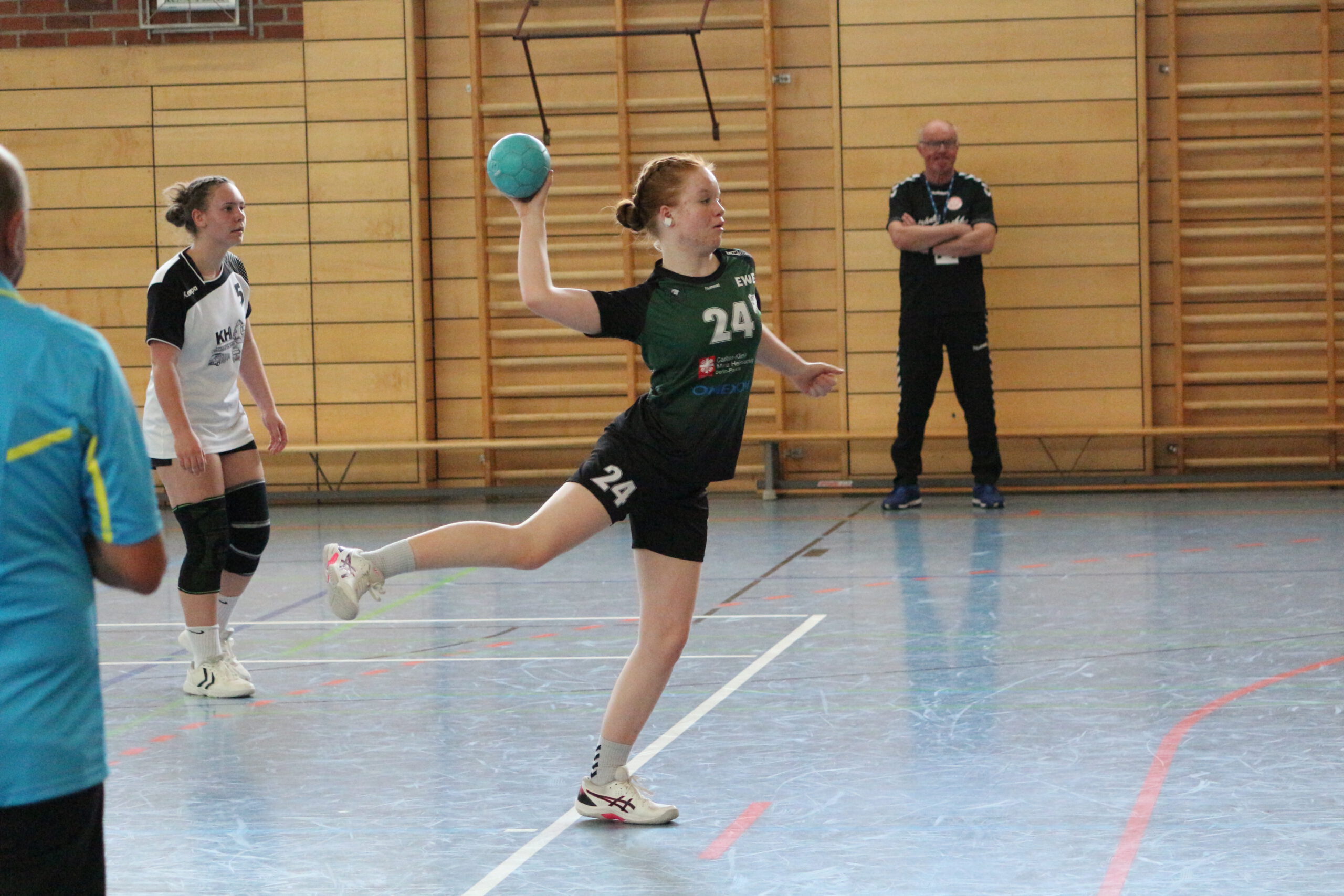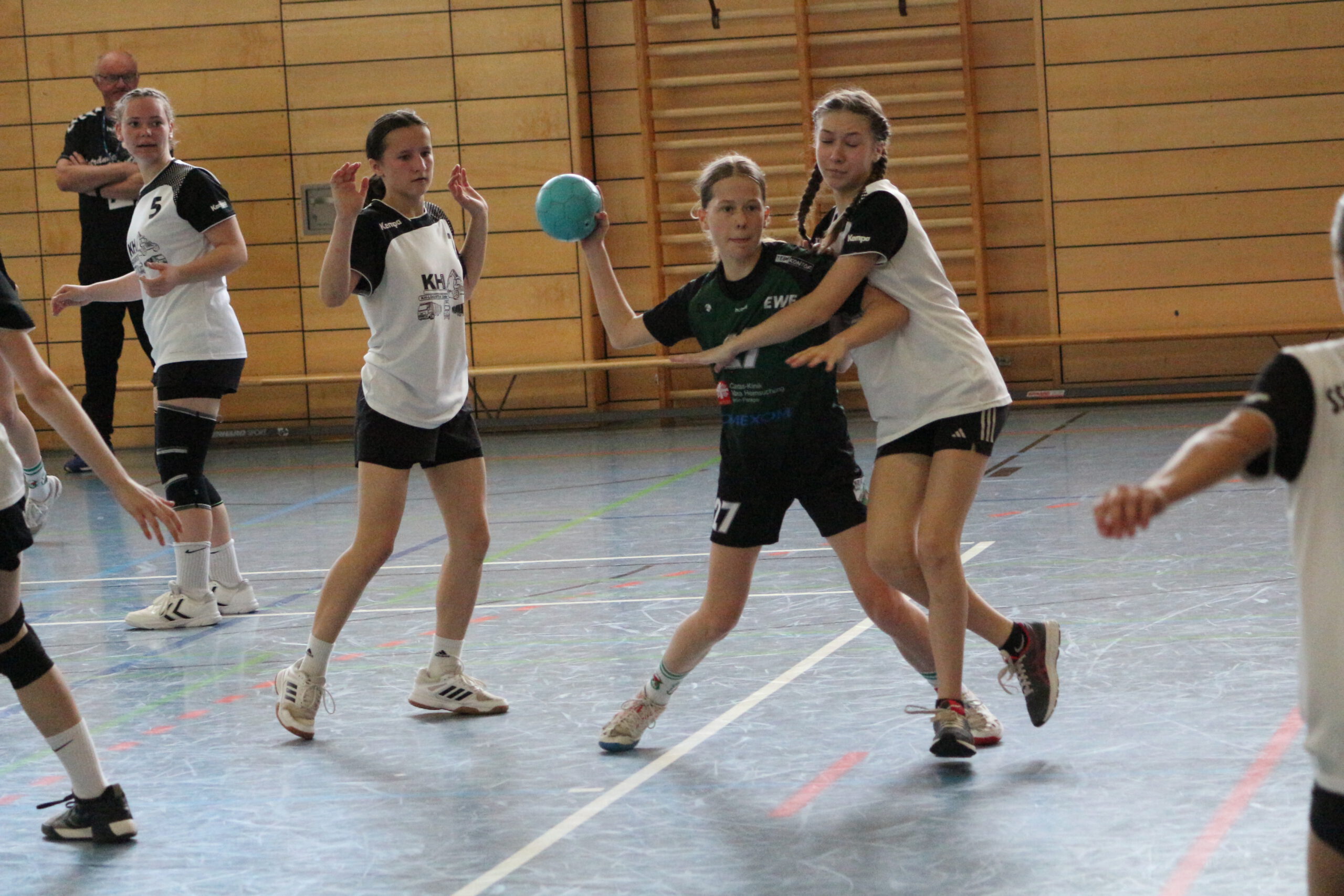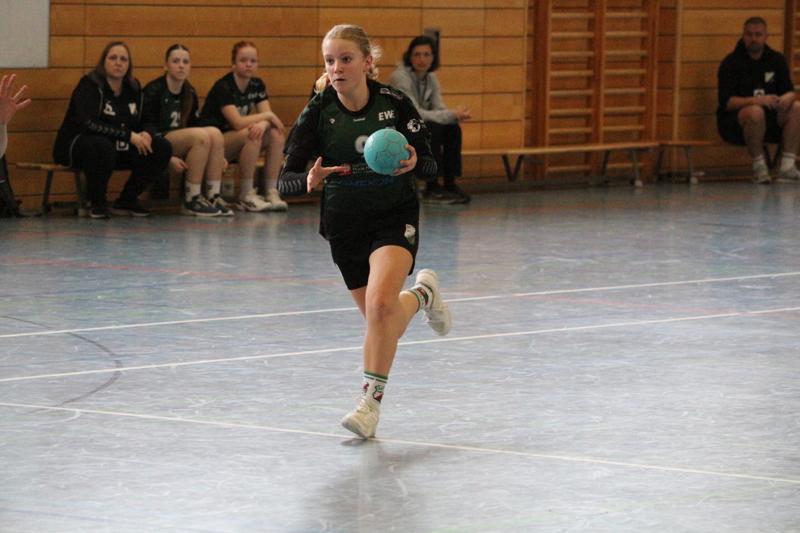 Das Spiel startete gut und alle kamen mindestens einmal zum Torwurf. Die Abwehr ackerte und unterband viele Pässe der Gegnerinnen. Schon nach kurzer Zeit führten wir komfortabel mit 9:2. Doch irgendwie kam dann ein Umbruch und die Stimmung kippte. Im Angriff leisteten sich die Mädchen einige Fehlwürfe und auch das Umstellen im Angriff, unsere Außen sollten nur in den Ecken stehen, ging nicht auf. Der Rückraum arbeitete weiter mit vielen Einzelaktionen, doch ein richtiger Spielfluss wollte sich nicht mehr so recht einstellen. In die Pause gingen die Mädchen gefrustet beim Stand von 13:4 für uns.
