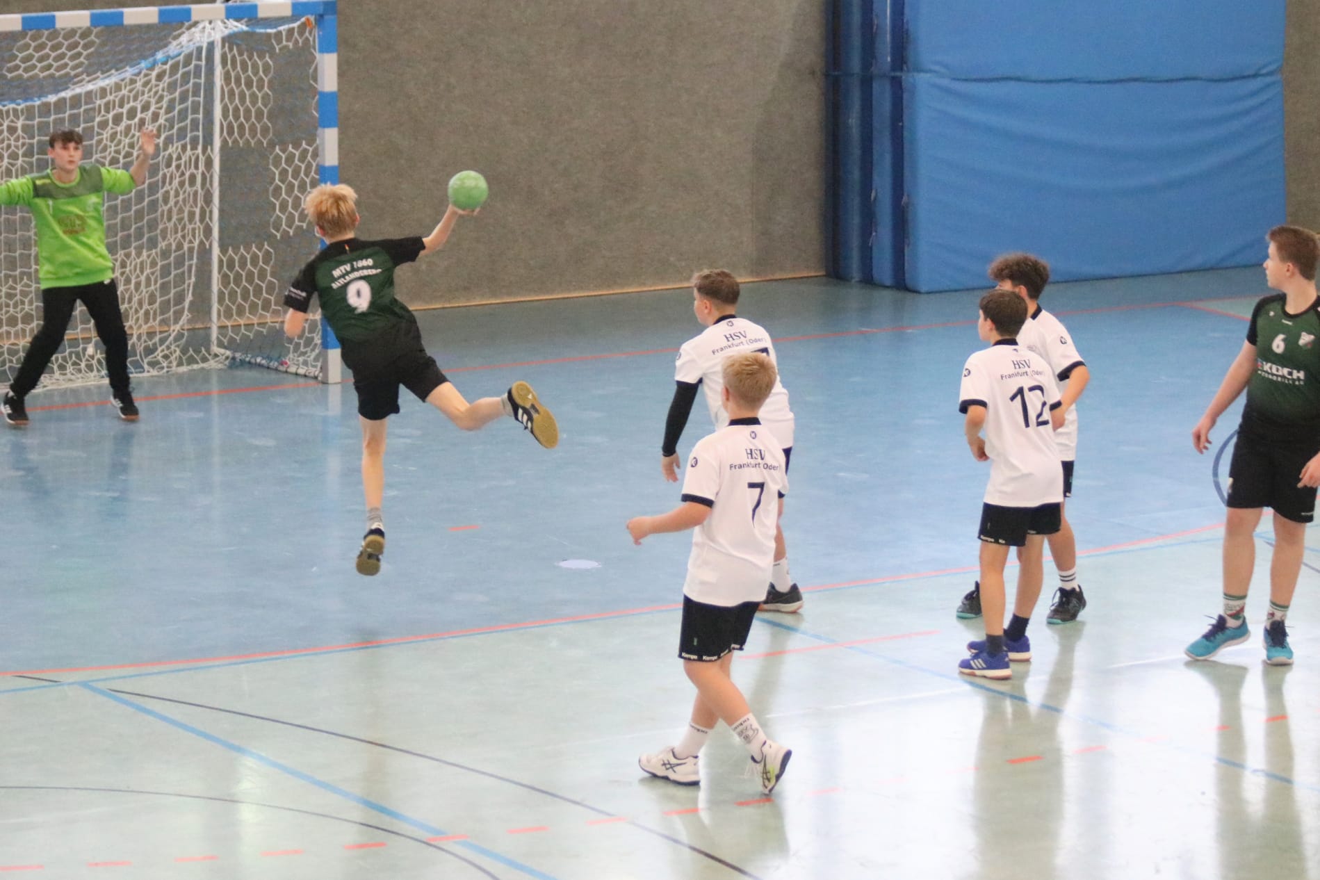 Nach einem gleichwertigen Auftakt konnten sich unsere Jungs ab der 10. Min bis zu einer Halbzeitführung von 11:8 absetzen. Immer wieder gelang es über Sandro auf HL und Timo am Kreis erfolgreich Angriffe abzuschließen. Ab der 30. Minute zum Stand von 18:14 war dann zu merken, dass wir schon ein Spiel in den Beinen hatten. Jetzt fehlte die Konzentration beim Torwurf und in der Deckung ließ die Intensität nach. Dies erkannten die Frankfurter Trainer und Spieler und holten Tor um Tor auf. Beim 18:19 hatten wir uns durch unsere Fehler schon fast um den Erfolg gebracht. Aber Sandro hat mit einer Einzelleistung das Unentschieden 50 s vor Schluss gerettet. Punktverlust ja, aber mit eigener Kraft einen Punkt gerettet. Und die Frankfurter Jungs sind wieder eine gute Truppe. Wir freuen uns schon auf das Rückspiel. Auch unsere Fans / Eltern sehen das so. Schließlich sollen die Jungs ja lernen !!!
