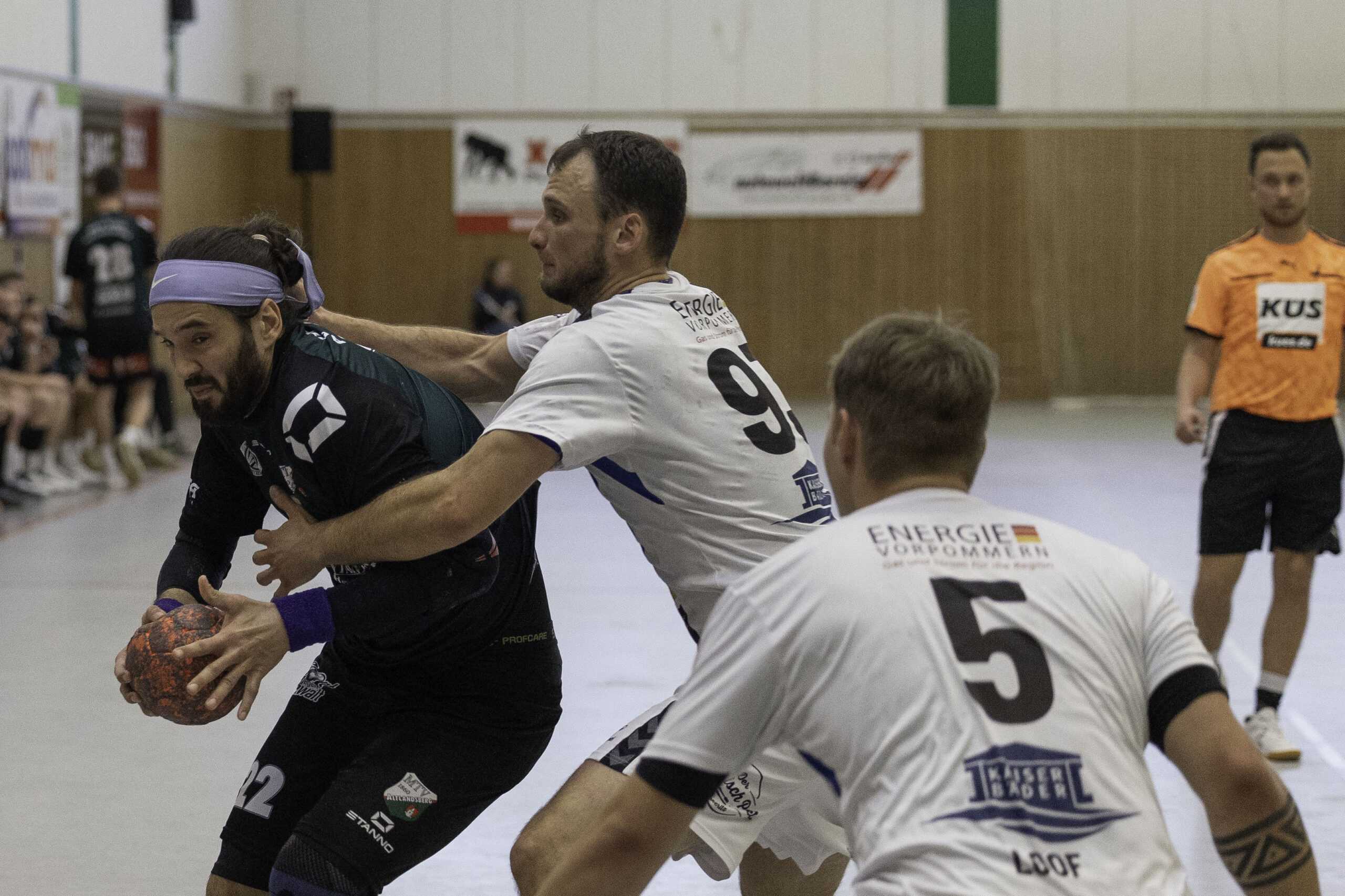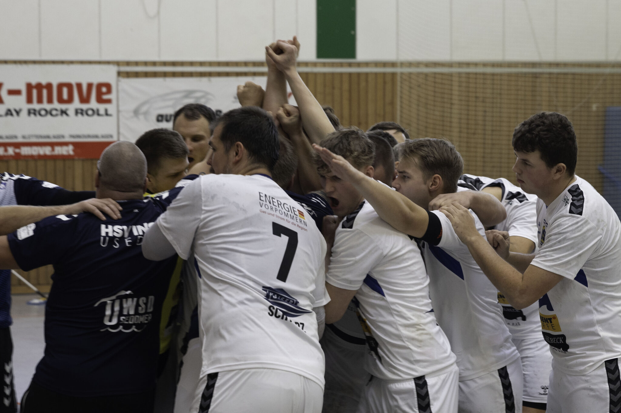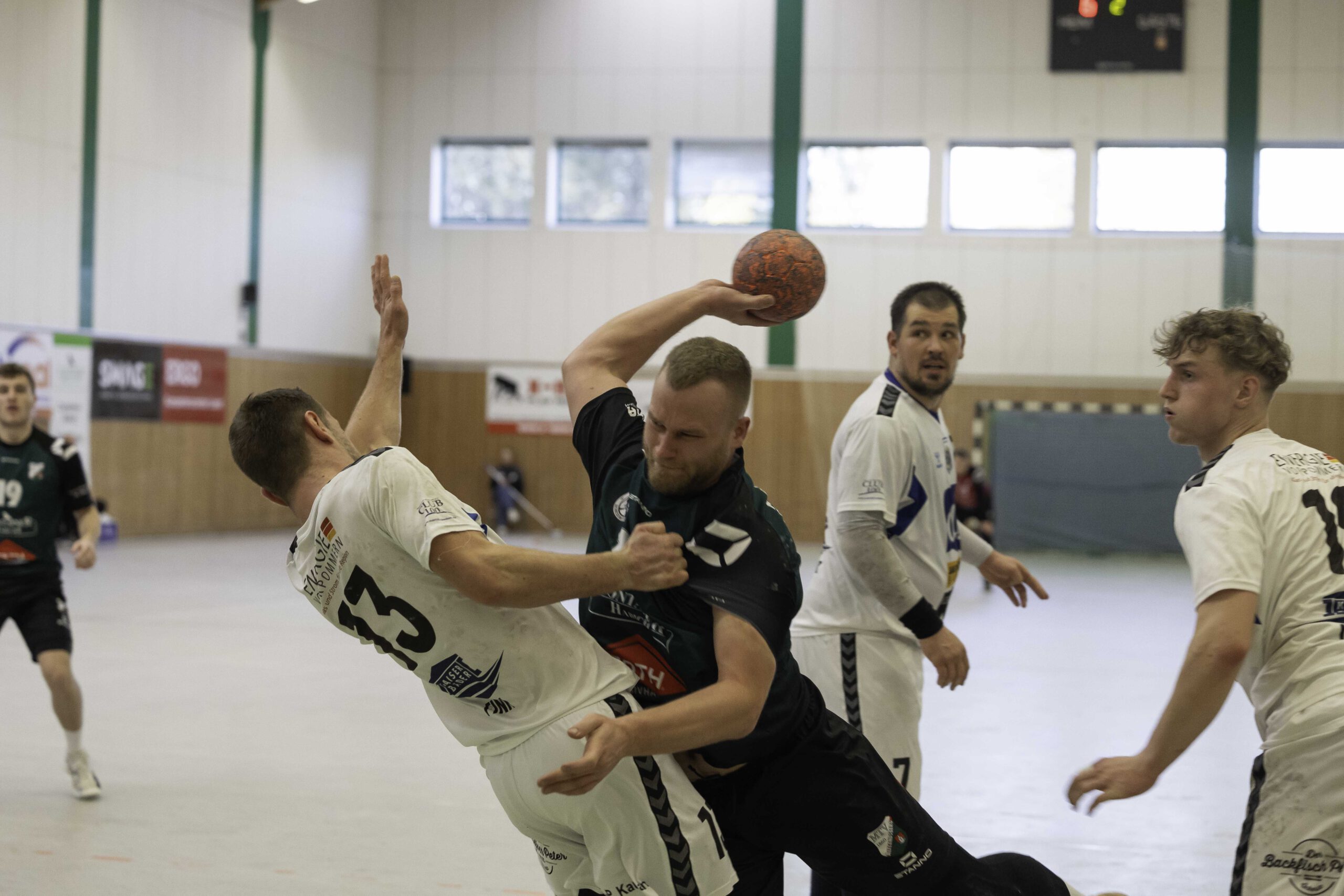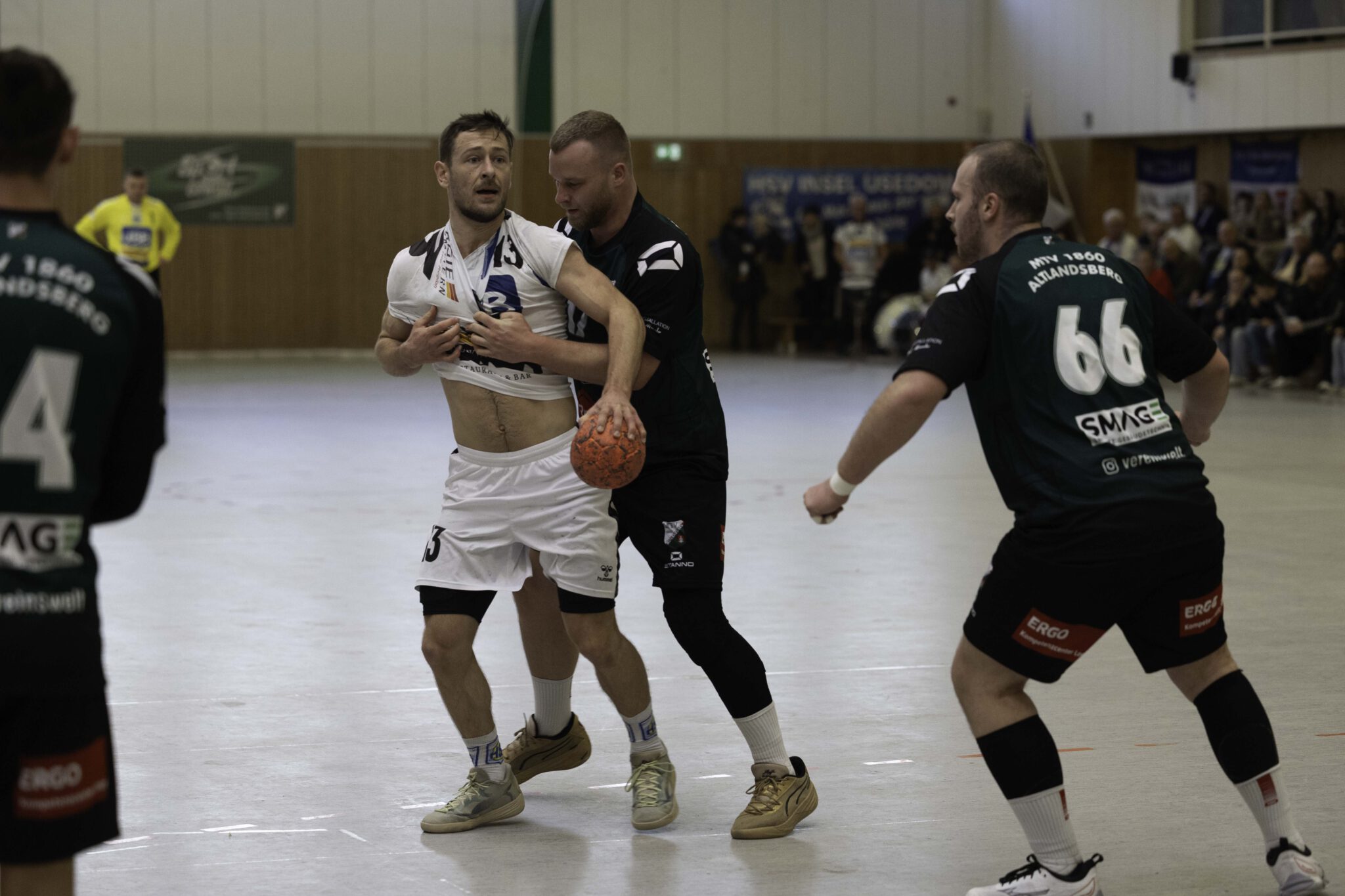Auch das Selbstbewusstsein war bei den Gastgebern deutlich zu spüren – „heute geht was!“. Zum Bespiel beim Sieben-Meter-Wurf von Tim Ermling. Mit einem Heber, über den baumlangen Usedomer Torhüter Lech Krynski hinweg, warf er zum 7:6 ein. Das war mutig und HSV-Trainer Patrick Glende bezeichnete die gesamte Leistung der Altlandsberger als „sehr mutig“. Der MTV konnte seine Führung behaupten und ließ sich auch nach zwei erfolgreichen Sieben-Meterwürfen für Insel Usedom nicht aus dem Rhythmus bringen. Beide Entscheidungen waren ziemlich umstritten, was sich nach der Pause sogar noch fortsetzen sollte. Zur Pause blieb die Partie völlig offen denn es stand 13:13. Dabei muss man sagen, dass es glücklich für Usedom war, denn der MTV hätte deutlich führen können. Aber auch in diesem Spiel haperte es wieder an der Chancenverwertung. Trainer Rudolf Föllen sagte leicht verärgert: „Wir hätten mit mindestens vier Toren Vorsprung in die Kabine gehen müssen.“