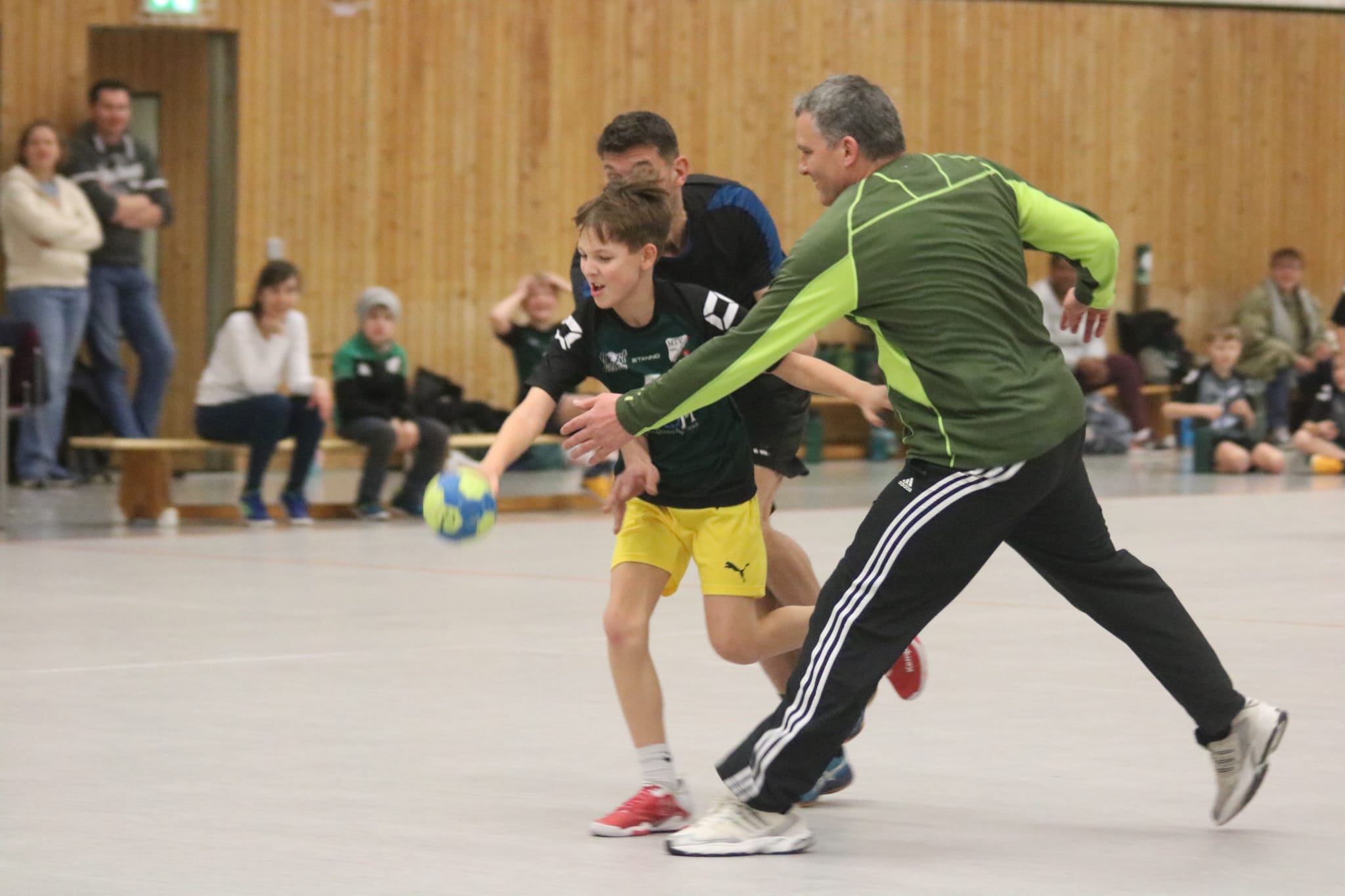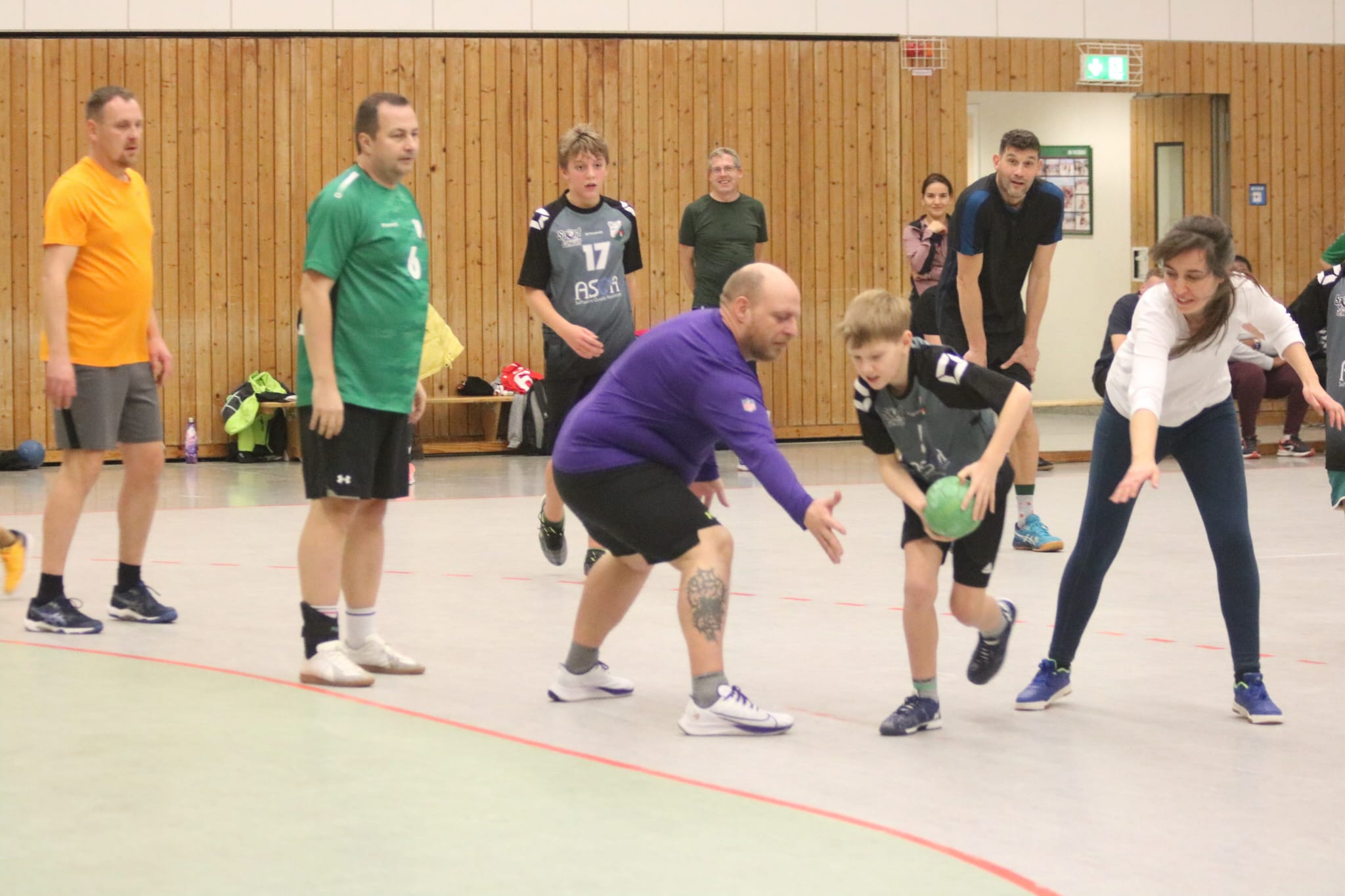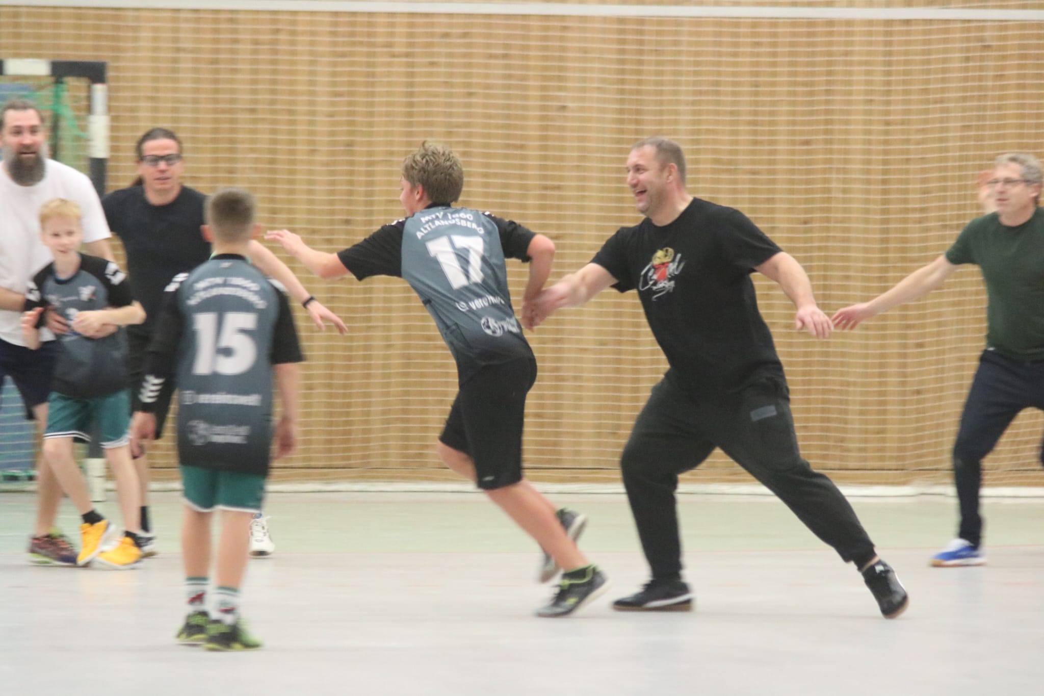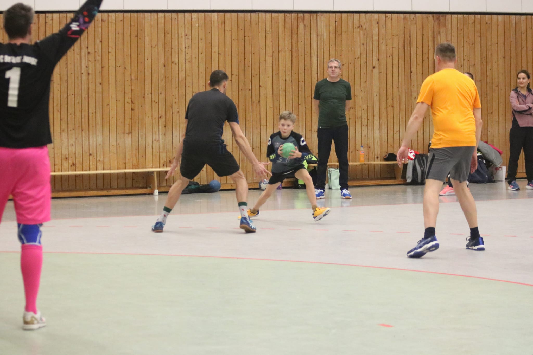 Bei den Spielen setzten sich dann insbesondere die – noch – Größenvorteile der Erwachsenen und deren unbändiger Siegeswillen durch. Da wurde in der Deckung geschoben, gehalten was das Zeug hielt. Alle kleineren Spieler wurden allein mit Körper zugedeckt !!! Im Angriff wurde von den Vätern aus jeder Lage auf das Tor geworfen. Sogar versuchte Sprungwürfe wurden gesehen.