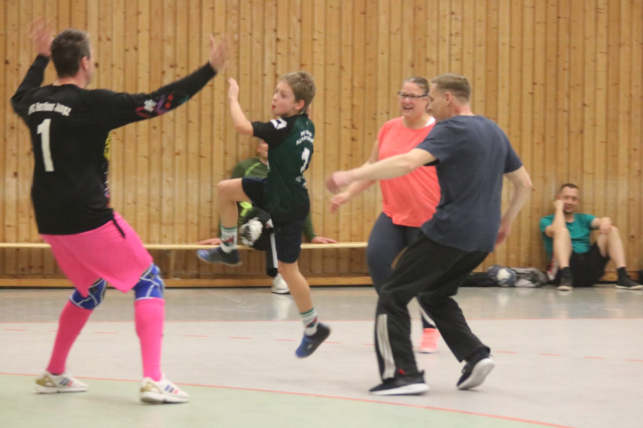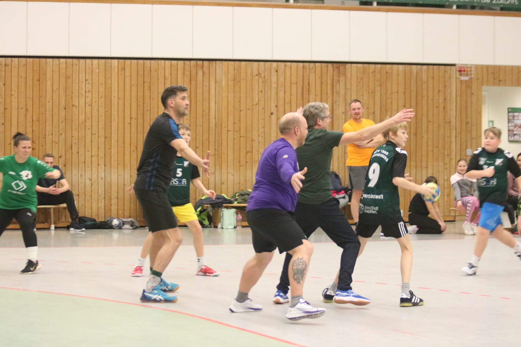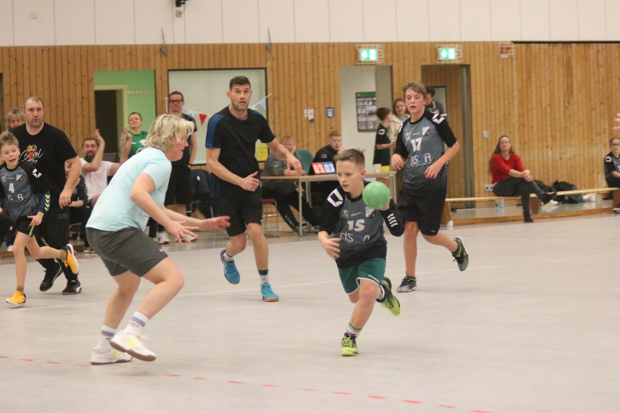 Bei den Spielen setzten sich dann insbesondere die – noch – Größenvorteile der Erwachsenen und deren unbändiger Siegeswillen durch. Da wurde in der Deckung geschoben, gehalten was das Zeug hielt. Alle kleineren Spieler wurden allein mit Körper zugedeckt !!! Im Angriff wurde von den Vätern aus jeder Lage auf das Tor geworfen. Sogar versuchte Sprungwürfe wurden gesehen.