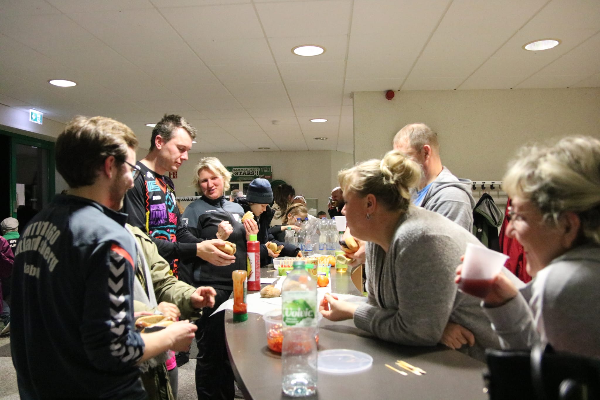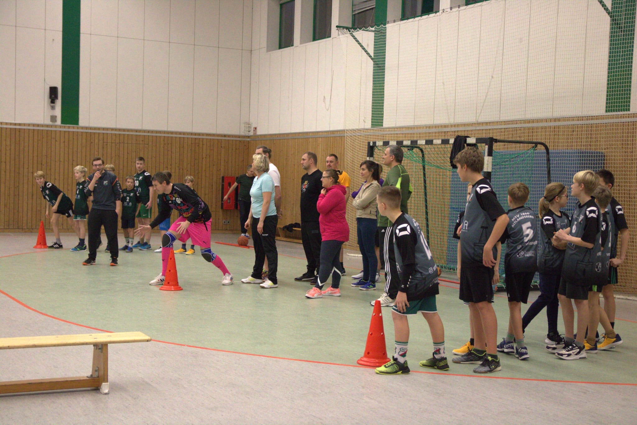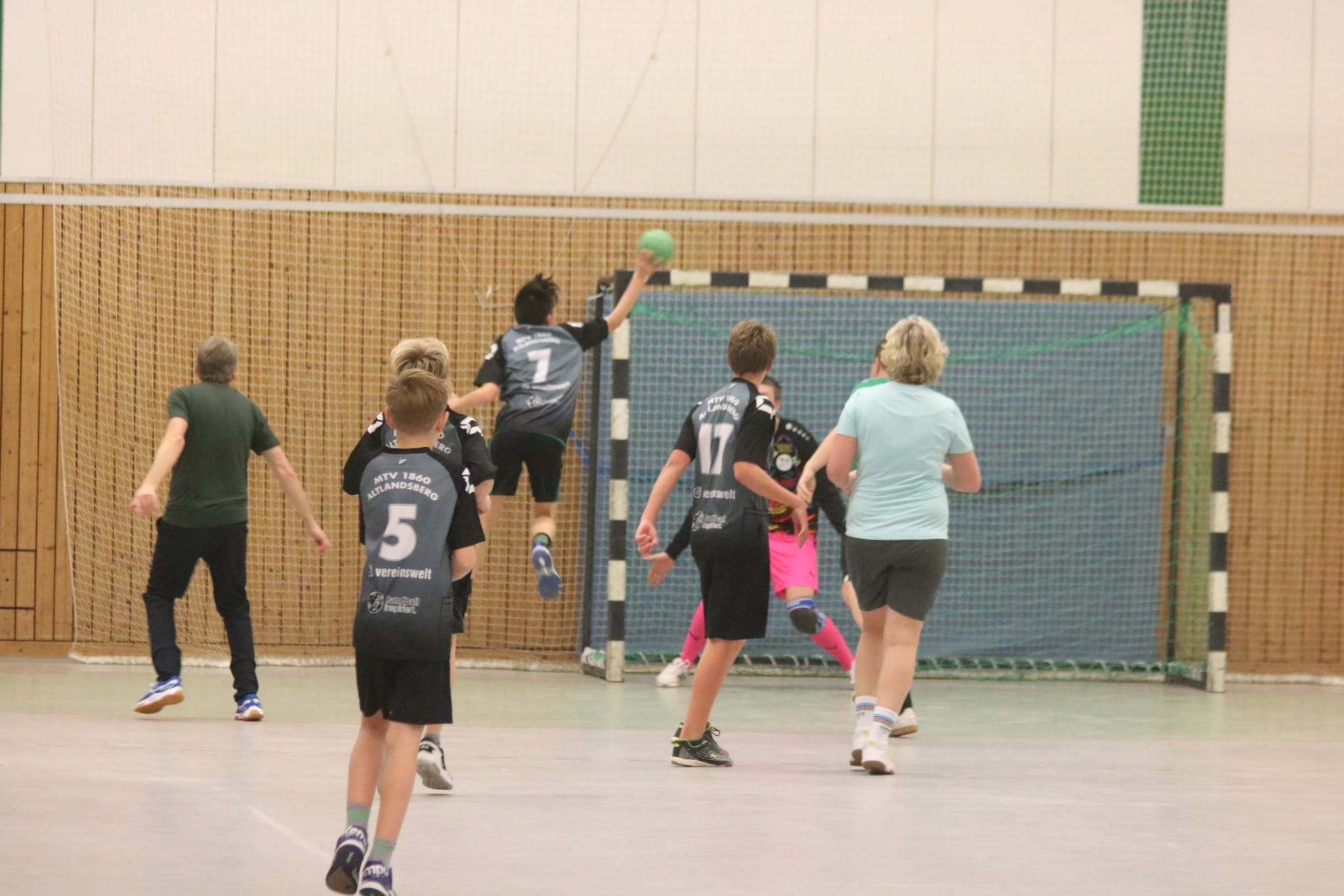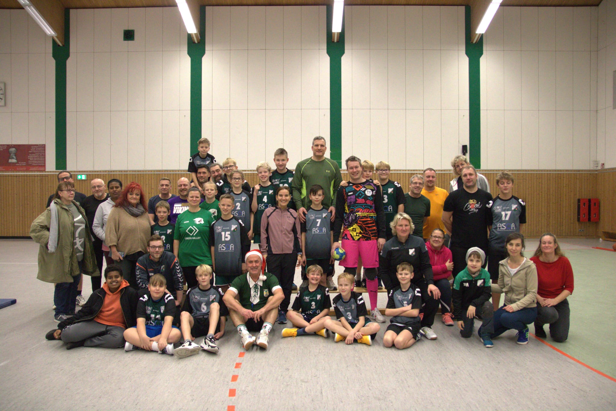 Bei den Spielen setzten sich dann insbesondere die – noch – Größenvorteile der Erwachsenen und deren unbändiger Siegeswillen durch. Da wurde in der Deckung geschoben, gehalten was das Zeug hielt. Alle kleineren Spieler wurden allein mit Körper zugedeckt !!! Im Angriff wurde von den Vätern aus jeder Lage auf das Tor geworfen. Sogar versuchte Sprungwürfe wurden gesehen.