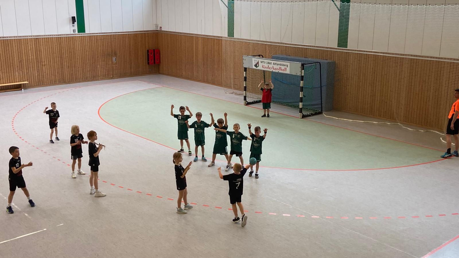 Am Sonntag, den 13.04.2025 fand eine Minispielrunde in unserer Erlengrundhalle in Altlandberg statt. Neben unseren Minis, waren noch der HSV Wildau, HSV Frankfurt (Oder) und die Ortsnachbarn – die OSG Fredersdorf-Vogelsdorf (je mit einer Jungen- und Mädchenmannschaft) und der Neuenhagener HC – mit dabei. Nachdem die Mannschaften begrüßt wurden, fand eine gemeinsame Erwärmung unter Anleitung von Spielerinnen der C- und B-Jugend des MTV statt. Die Jungs und Mädels aller Mannschaften kamen hierbei schon gut ins Schwitzen, denn neben dem gut organisierten Aufwärmprogramm, taten auch die schon fast sommerlichen Temperaturen ihr übriges dazu.