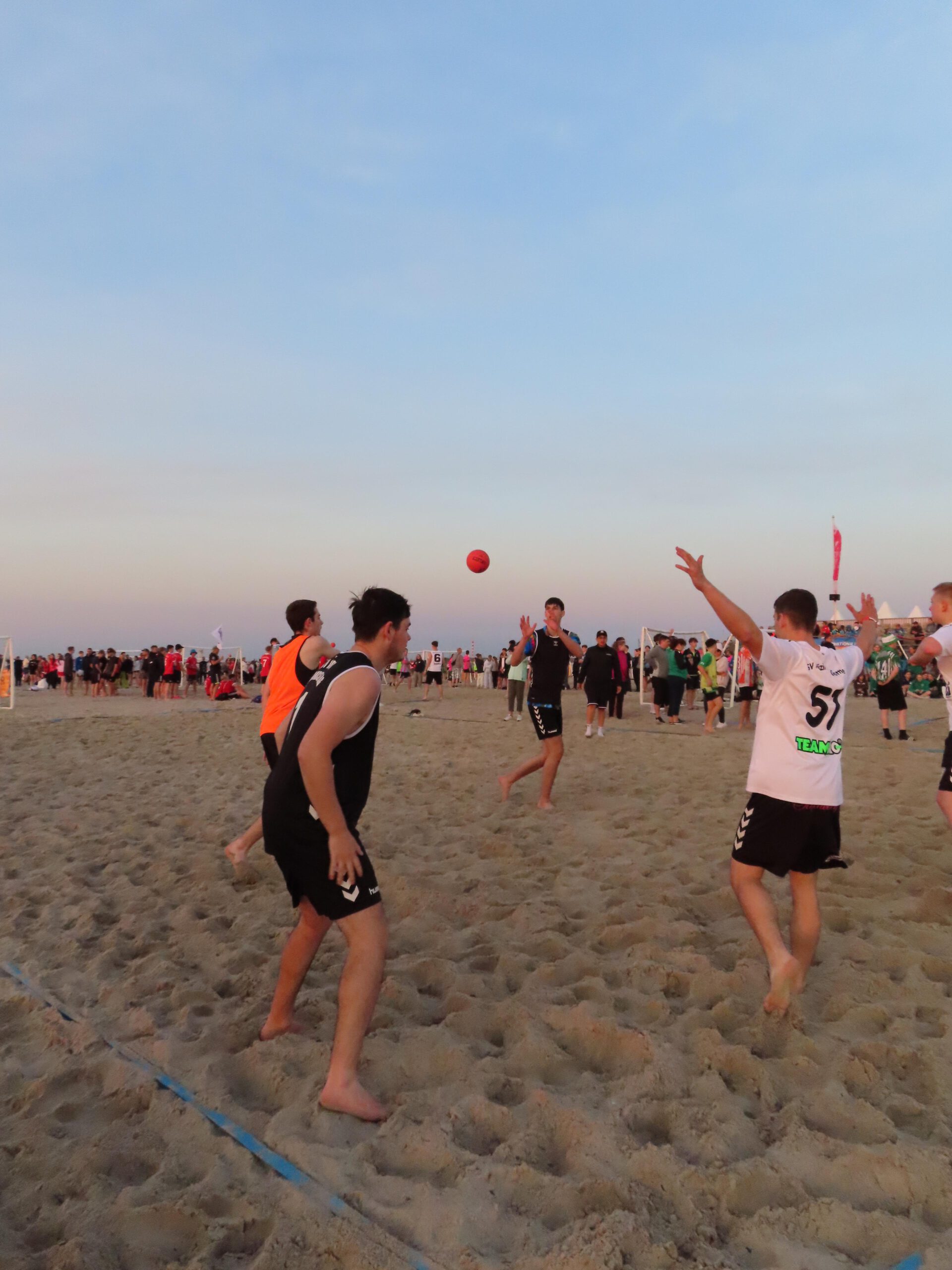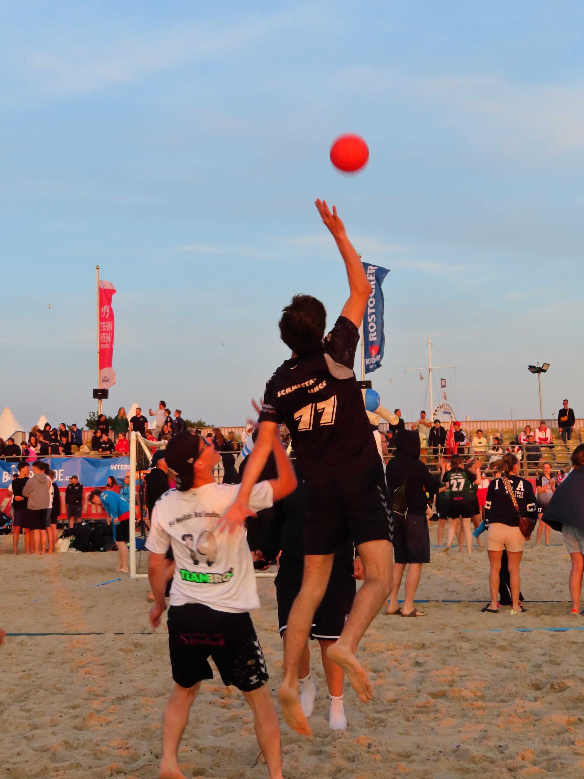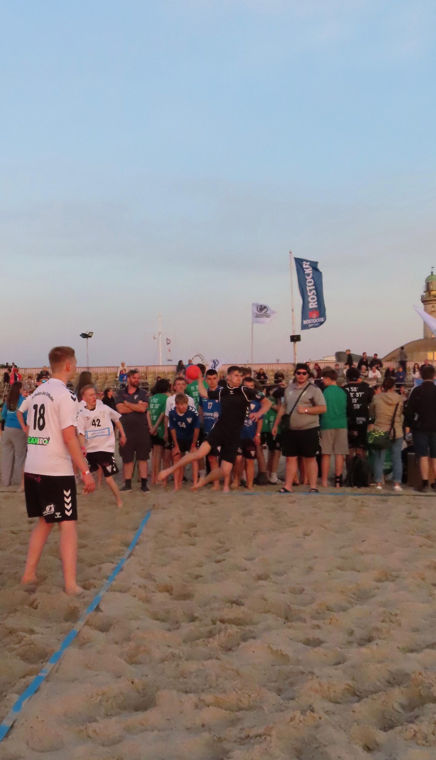 Also wurden am Freitag nach der Schule und der Arbeit die Taschen gegriffen, ins Auto gepackt und sich auf den Weg in Richtung Norden gemacht, um um 19:30 Uhr bei der Eröffnung und dem Einlaufen aller Mannschaften dabei zu sein. Jede Mannschaft wurde nacheinander aufgerufen und durfte durch einen Tunnel vor der Tribüne am Strand einlaufen und sich präsentieren. Anschließend stellten sich alle Teams in einem großen Rechteck auf und es drehte eine Laola-Welle ihre Runden.