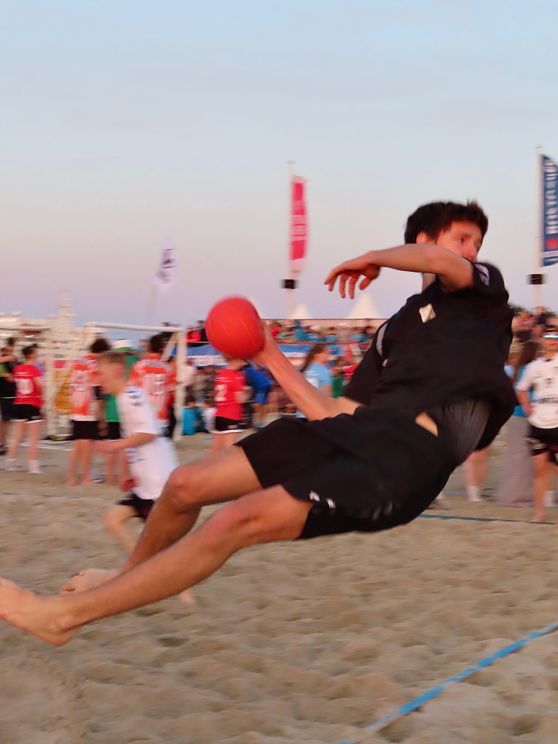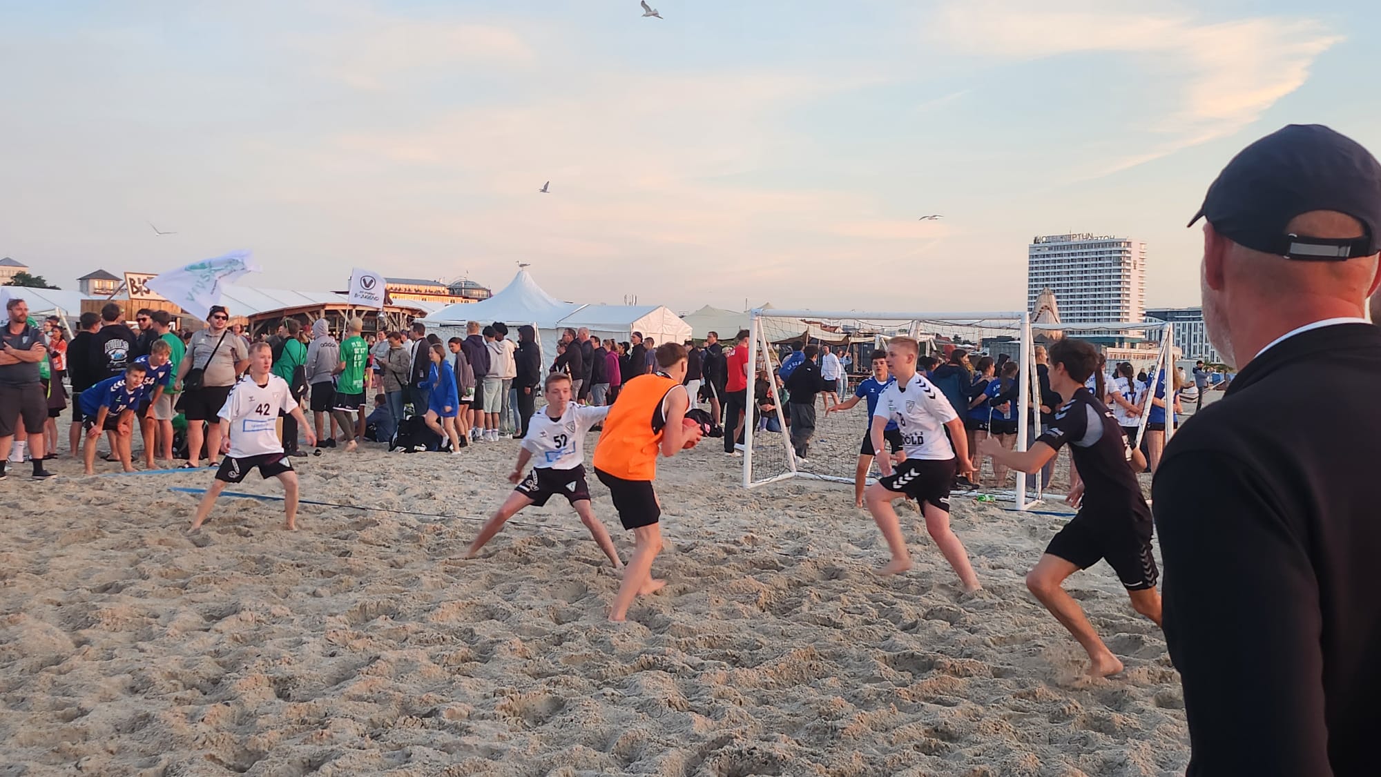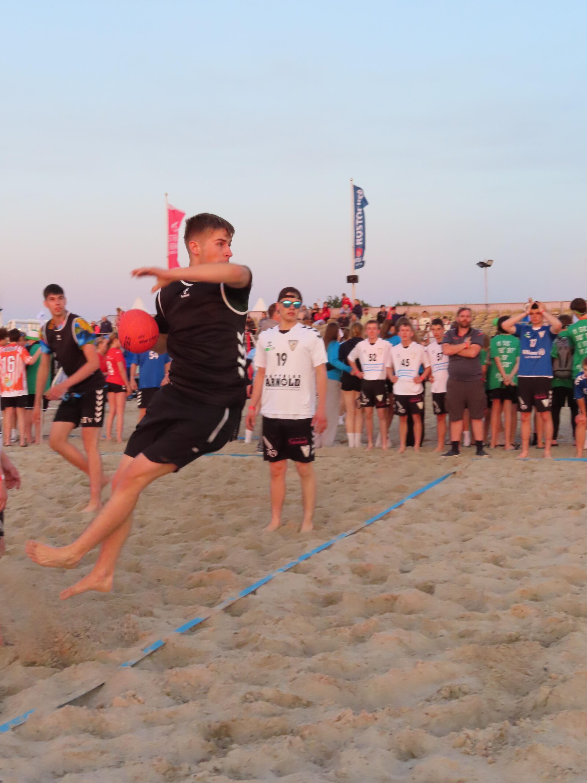 Also wurden am Freitag nach der Schule und der Arbeit die Taschen gegriffen, ins Auto gepackt und sich auf den Weg in Richtung Norden gemacht, um um 19:30 Uhr bei der Eröffnung und dem Einlaufen aller Mannschaften dabei zu sein. Jede Mannschaft wurde nacheinander aufgerufen und durfte durch einen Tunnel vor der Tribüne am Strand einlaufen und sich präsentieren. Anschließend stellten sich alle Teams in einem großen Rechteck auf und es drehte eine Laola-Welle ihre Runden.