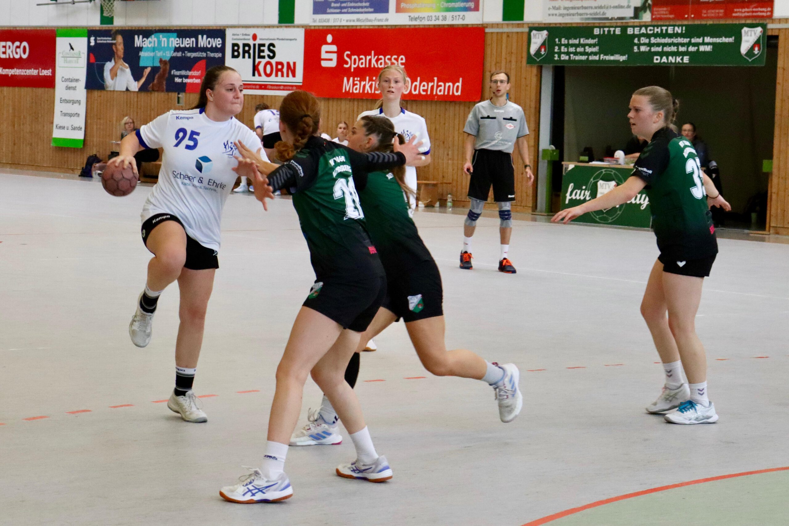 Am Samstag stand für unsere Mädels das erste Auswärtsspiel der Saison in Strausberg auf dem Programm. Die Gastgeberinnen traten mit einer offensiven 3:3-Deckung an, doch von Beginn an ließ der MTV keinen Zweifel daran, wer das Spiel dominieren würde.